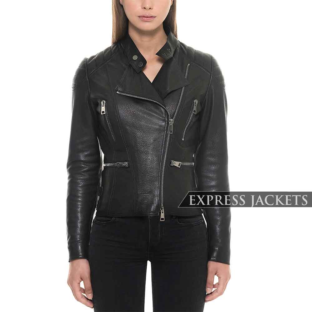 Quilted pattern, biker components, and functional properties across the board leather jacket prepared to take your style to a higher level. Stitched with tested material and falls under stylish detailing. It is an ideal good-to-go piece for every lady. The costume is available in black color which gives an intense look. The soft inner viscose lining makes it comfortable and can be enjoyed for a long time. The stunning features of this Black Quilted Shoulder Leather Jacket are a round snap tab collar, front zip fastening, full sleeves with zippered cuff, and multiple pockets. The slim-fit style is enough to get a sexy look during hangouts. The class is good to go with skinny-fit leather pants or jeans and sleeves less top and low top white sneakers.