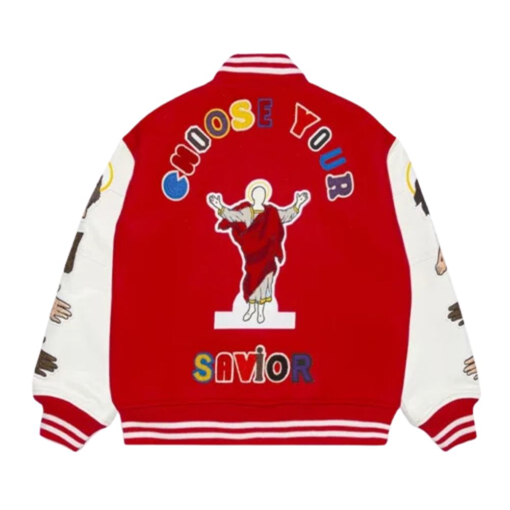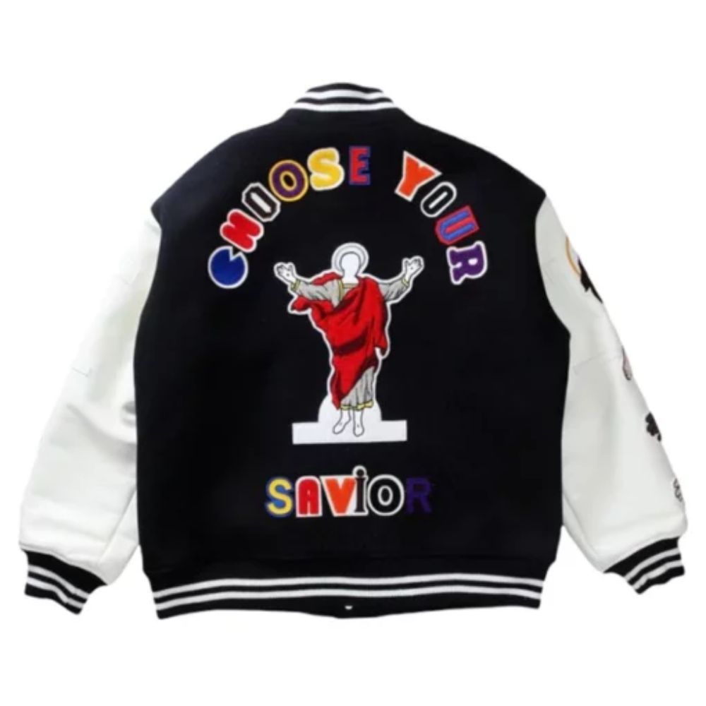 Elevate your wardrobe with the “Choose Your Savior Varsity Jacket” – a masterpiece that fuses style, comfort, and quality seamlessly. Make a statement wherever you go, and let your fashion do the talking!