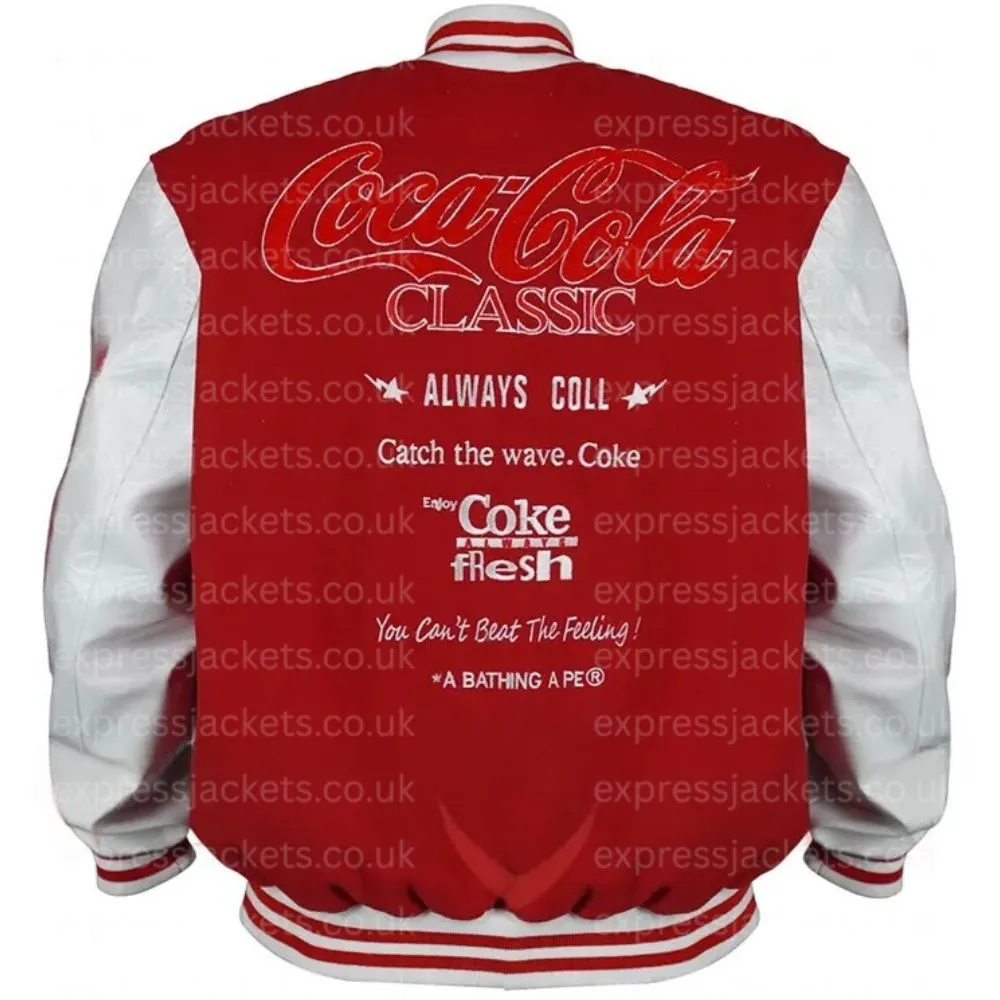 This red and white Coca Cola jacket which we present is made of high quality wool with genuine leather sleeves for durability and classic varsai appeal. We’ve included a viscose lining which is soft against the skin. It has a snap front closure, ribbed collar, cuffs and hem for that close fit. Also it has long sleeves and two pockets inside and out which add to the look and function. The red and white color scheme really puts the seal on the design.