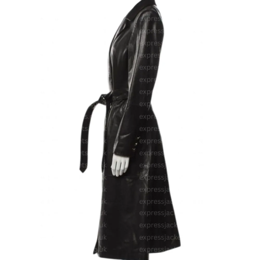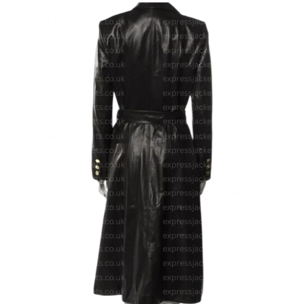 Dove Cameron Black Leather Belted Coat – Sleek Statement Style