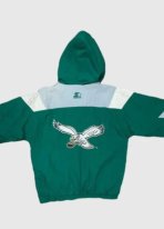 Well not only is the Eagles Starter Jacket a tribute to the Eagles, but it’s also a throwback with a stylish fresh take on retro. Breathable Comfort: This soft cotton jacket lined in viscose makes for a breathable and comfortable wear, and the color green and white actually pops and looks good on a jacket A hooded collar and half-zip front closure enable versatility, while long sleeves with elasticated cuffs ensure a cozy, secure fit. A simple pouch pocket gives added utility to this modern classic, perfect for the weekend or colougn weather layering.