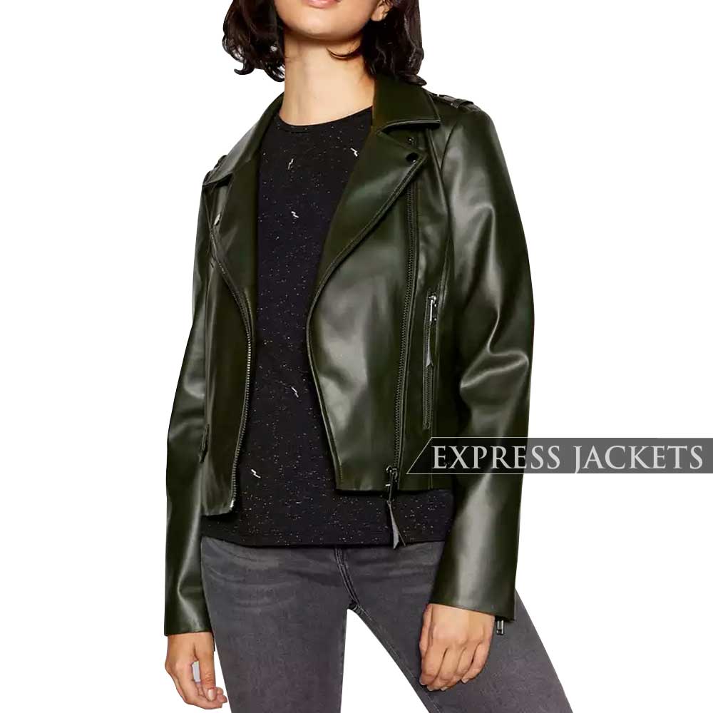 WOMEN OLIVE GREEN FAUX LEATHER JACKET