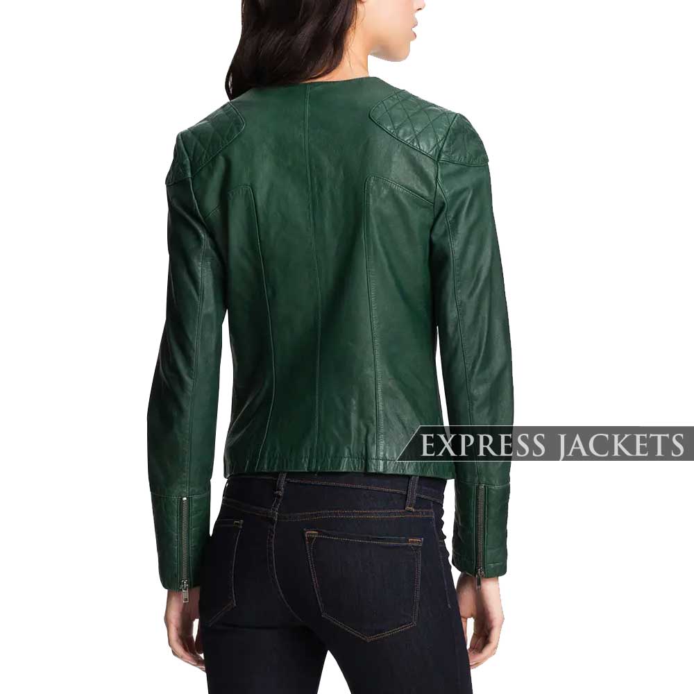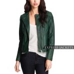 Green Leather Jacket Women was fabricated with the excellenc of genuine leather and viscose fabric for the ultimate quality. It has a beautiful green color that can go with all of your garments and is guaranteed that you will have fun playing around with different outfits. It consists of simplistic features like a zipper closure, round neck, and zipper cuffs. The creators have accurately crafted the quilted panel on the shoulders and sleeves. Style it with a white Tube top and black slim-fitted jeans along with white sneakers for a breezy look. And for a semi-formal appearance, go for a white turtleneck tucked inside black jeans and black Chelsea boots. You can also go for a plain white Tee and denim jeans along with some sneakers.