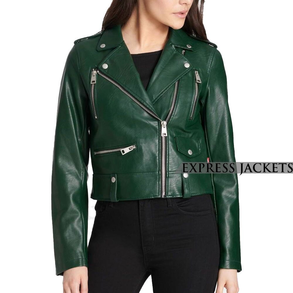 Every woman seeks to be a modish look, and for this purpose, she picks the new and trendy leather jacket; for sure, an upper in leather plays a significant role in the stunning look; try this ultra-modern green leather jacket for women. The outer layer is an unexpected appearance that is captivating and sexy. Being fashion divas, you can be picky with this top layer which we have prepared in supple and high-quality leather. The costume is comfy but stylish because it has a short length. The incredible fashion piece offers basic features such as a lapel collar, front zipper closure, full sleeves, and pockets. The epaulets on the shoulders are a vital sign of bold female personalities; try it now. Getting a unique and new green color jacket has become an absolute need for fashionistas, every bold and robust woman tries to get complements by paying attention to trendy pieces of fashion; this jacket is a beautiful look for females who work and do not have time to make a great closet to according the weather.