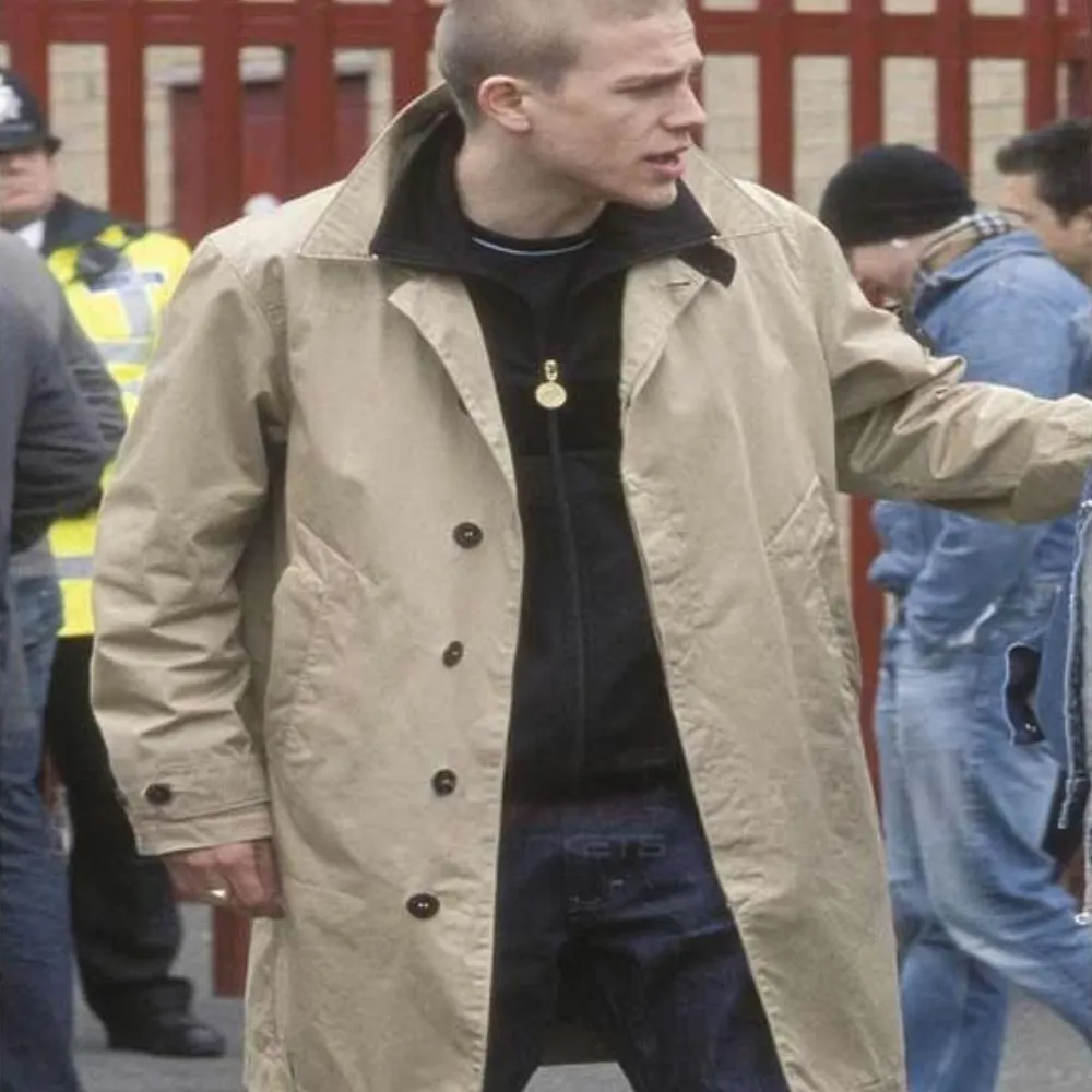 Green Street Hooligans Charlie Hunnam Pete Dunham Coat Jacket. Made with a front buttoned fastening that includes an inner polyester lining for comfort, this beige trench coat is finished with an iconic Stone Island patch to each sleeve. Equipped with two side pockets, the design is inspired by the popular drama film Green Street Hooligans. Made in genuine or faux leather, it mixes up the best of both worlds with authenticity and wearing while Charlie Hunnam wears the look as Pete Dunham in the movie. All sizes are available.
