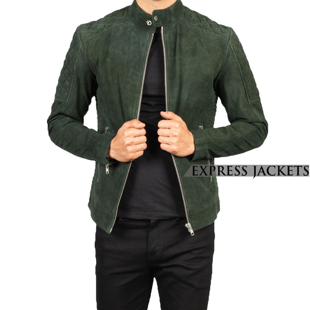 Men’s Slim-Fit Green Suede Biker Jacket — Stylish & Durable
