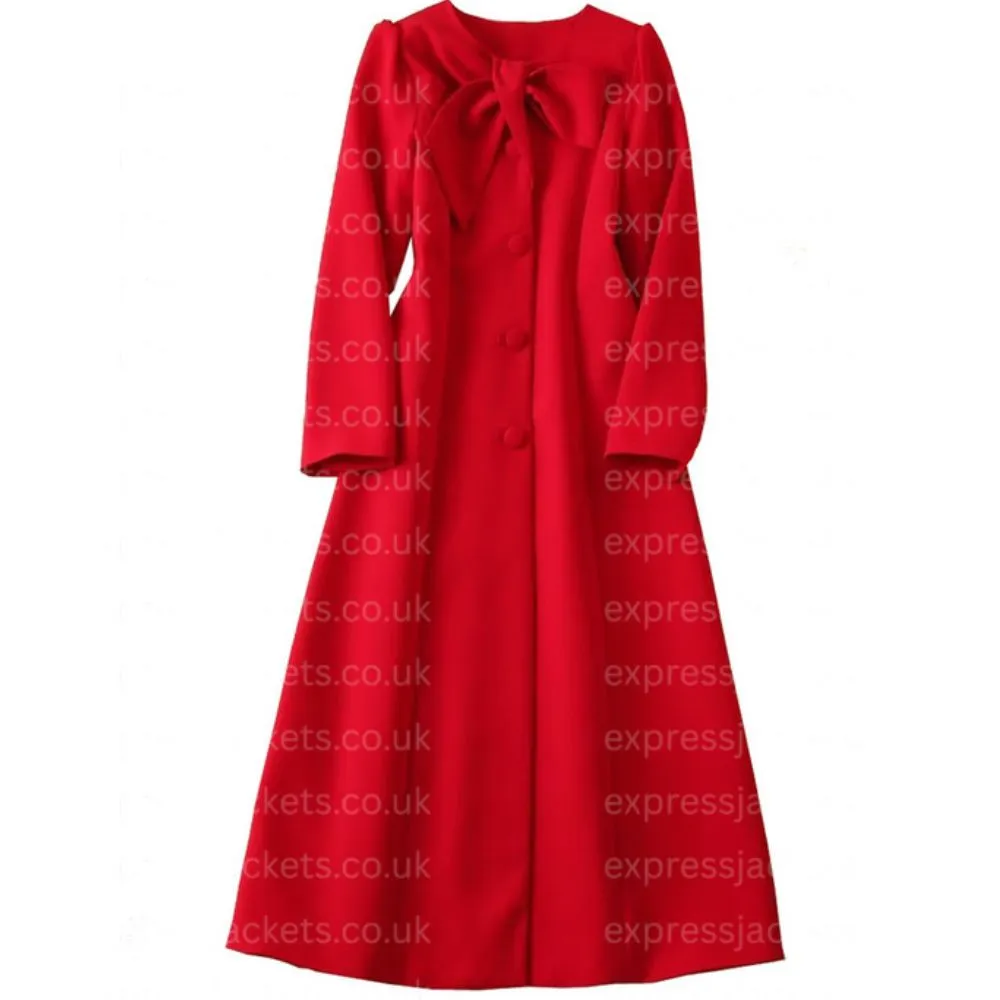 This Kate Middleton dress red coat has put on this premium wool blend coat that also includes a soft viscose lining which provides warmth and comfort. It has a front button closure, graceful bow style collar, long sleeves, and round cuffs for a very tailored look. Also it features two outer and one inner pocket which brings in that element of practicality along with a classic touch. The deep red color brings a royal air to your wardrobe.