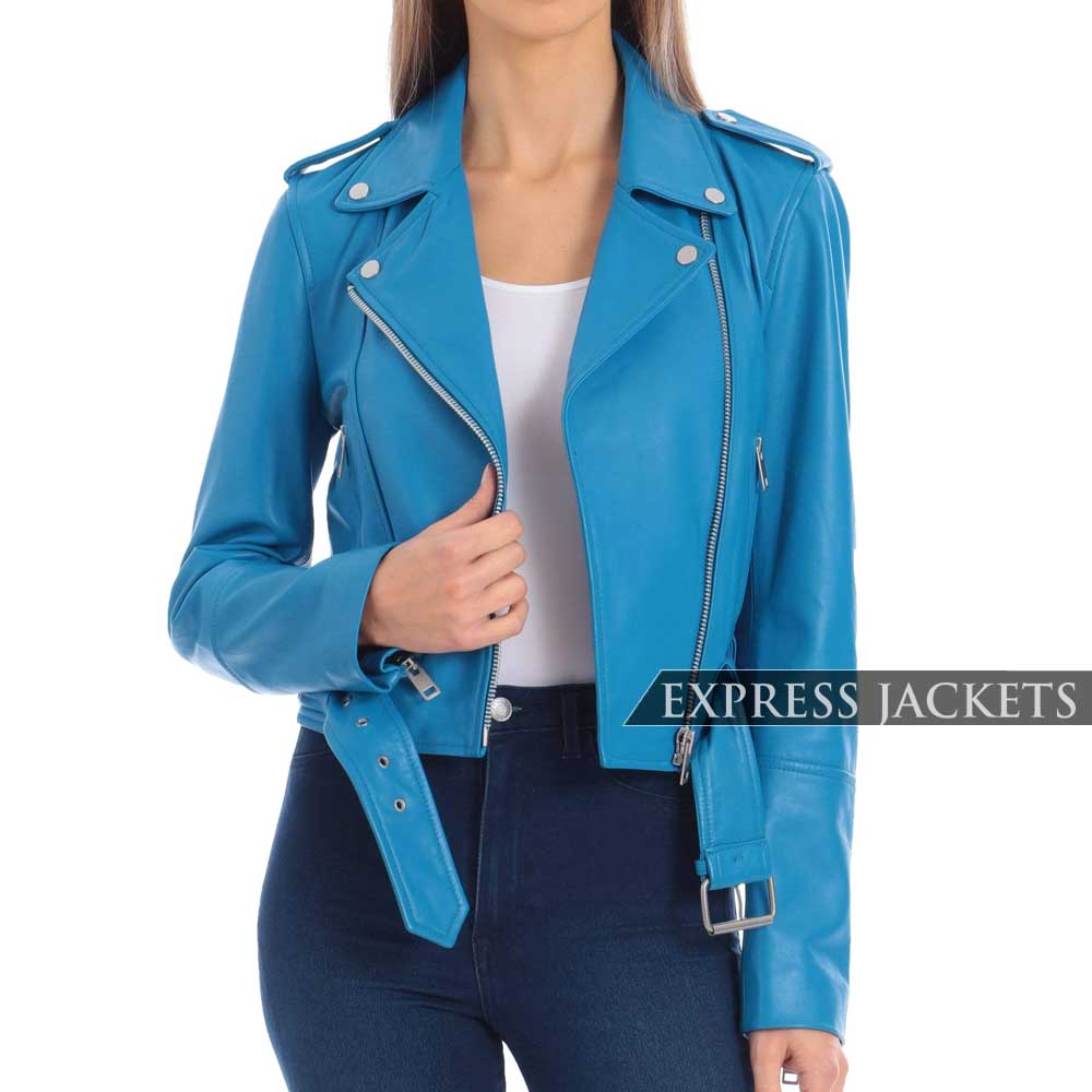 Leather is a good material used for a casual glance and touch; it feels like elegant and durable outerwear and provides good protection in winter. It is a real investment for your closet and is available in a good range. This blue leather jacket is an attractive staple for women, and they can enjoy it on regular occasions and activities. It comes in a beautiful light blue color, which is new and unique, especially in leather products. To give you comfortable wearing, we provide a soft inner lining of viscose. This style’s noticeable features are a lapel collar, front zip fastening, full sleeves with zippered cuff, and two zippered pockets on the waist along with inner options. We suggest correctly hanging your jacket.