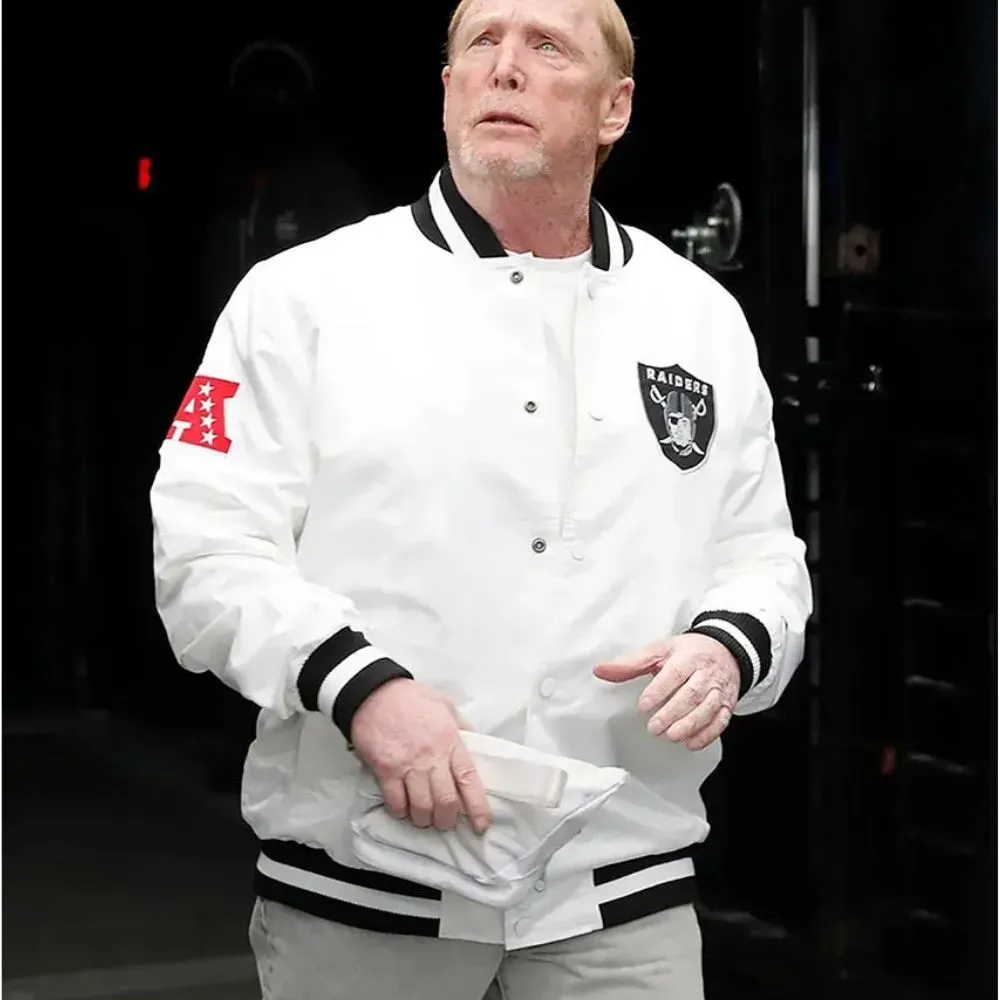Show off your support for the team in a bold way with the Mark Davis Las Vegas Raiders White Jacket which we have designed for fans that want to make a statement. Made from premium satin with a soft viscose lining this jacket is at once comfortable and luxurious. The rib knitted striped collar, cuffs and hemline add a sporty element while the full snap tab button closure brings a touch of that retro varsity look. Its bright white color pops against the Raiders’ identity which will have you turning heads whether you’re at the game or out on the town. With two front waist pockets it is practical as well as stylish which means you can keep your essentials close by. This jacket is a must have for die hard Las Vegas Raiders supporters which want to blend sports heritage with modern street wear fashion.