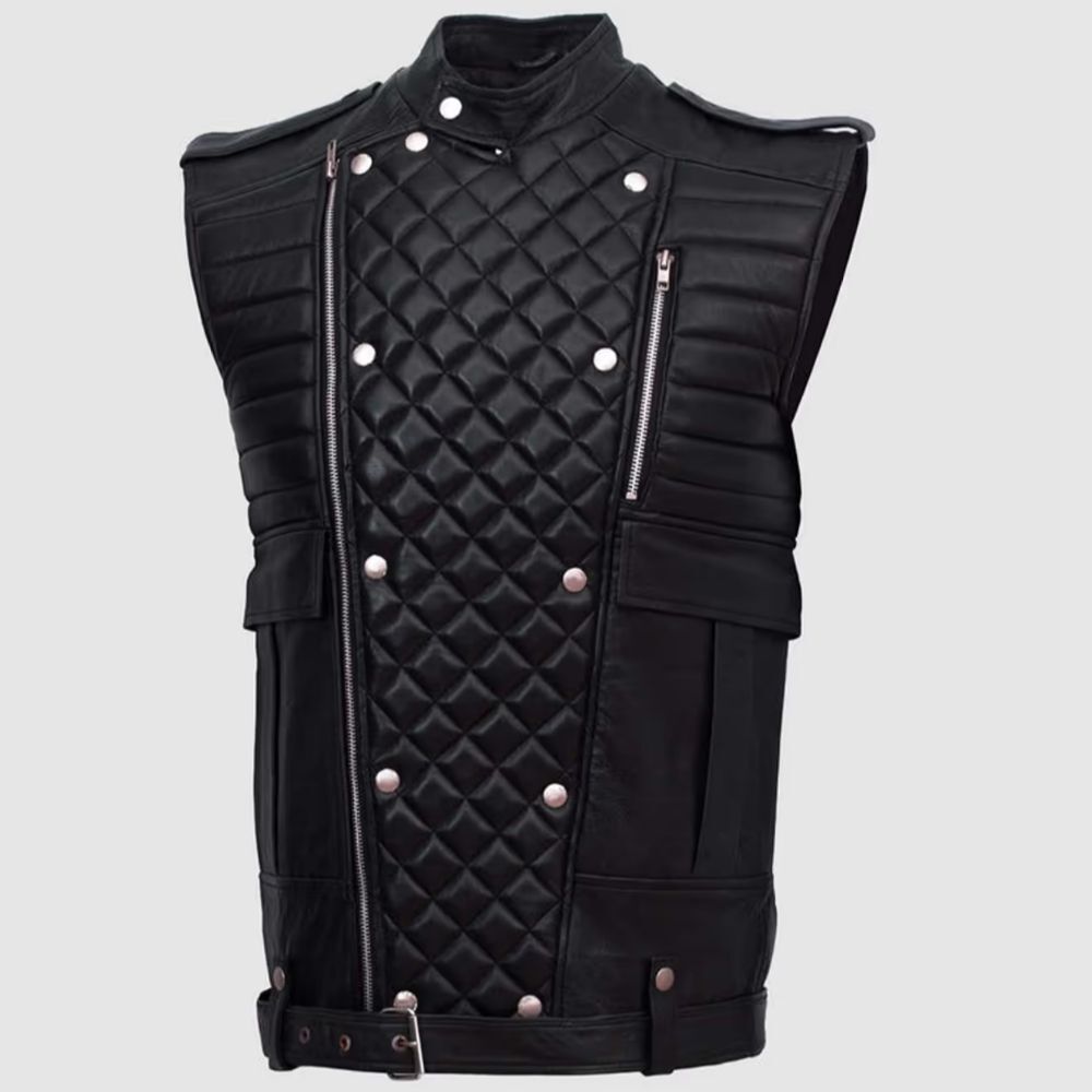 Men’s Black Leather Motorcycle Vest – Quilted Biker Vest with Belt & Epaulettes