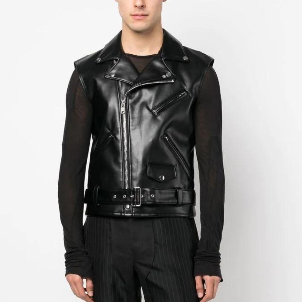 Make a daring fashion statement with this classic men’s sleeveless Biker Jacket in faux leather. The jacket features an asymmetrical zipper front and notched lapel collar with a snap closure and adjusted belted waist for a rugged biker -style attitude. Now, this sleeveless jacket offers layering styling versatility and is equally perfect for both casual day outfit or street style at night. The Men’s black sleeveless biker jacket features two chest zippers, one waist zipper and one inside pocket for functional storage of all of your daily essentials. The Men’s Black Sleeveless Biker Jacket is fully lined in soft viscose fabric for a comfortable fit while maintaining plenty of attitude for the modern rebel.
