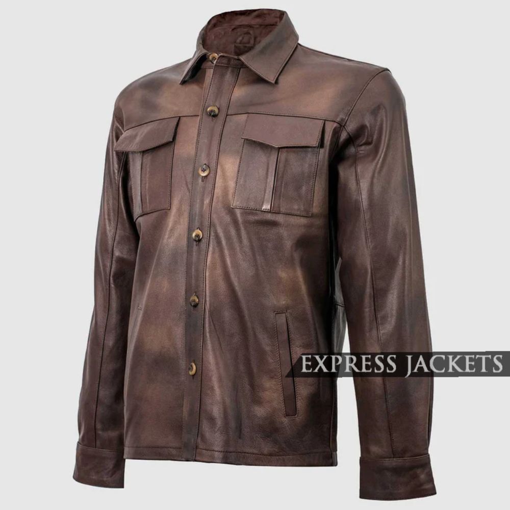 Men’s Brown Cowhide Leather Shirt-Style Jacket – Durable, Classic & Convenient