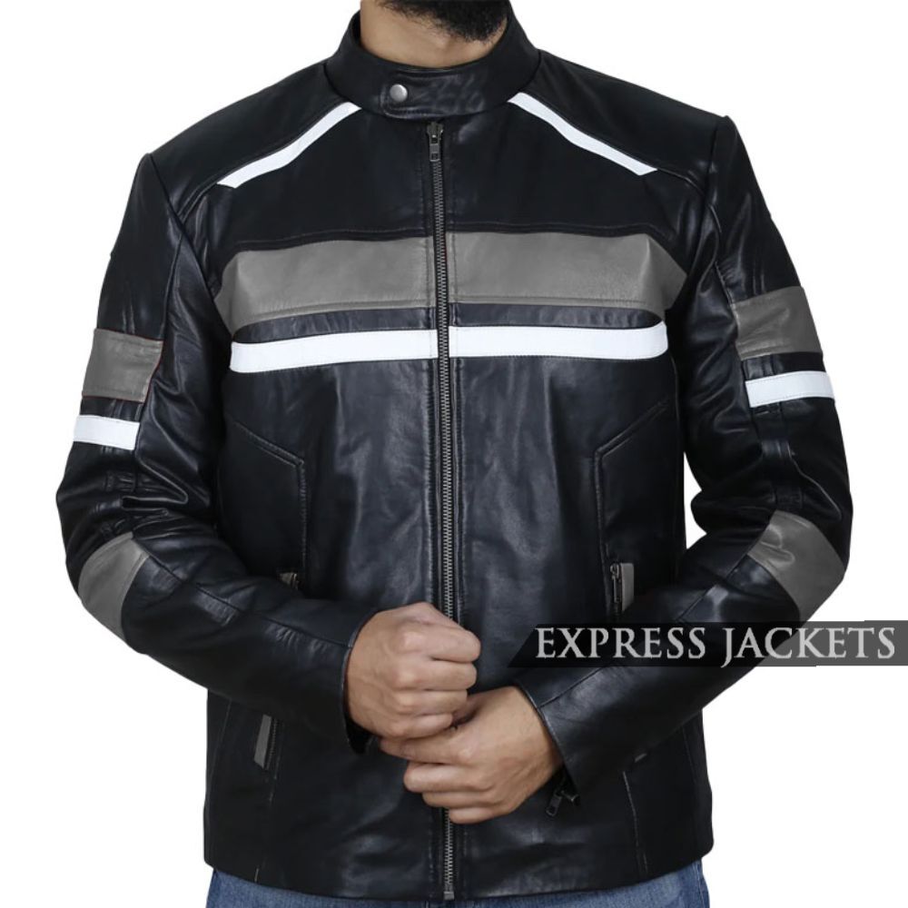 Men’s Black Classic Stripe Pattern Leather Jacket