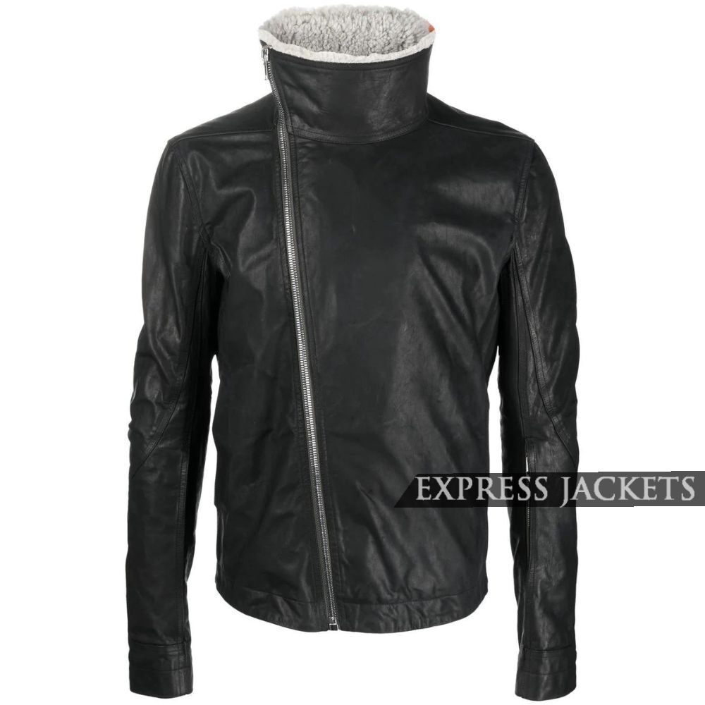 Men’s Black Fur Lining Asymmetric Leather Jacket
