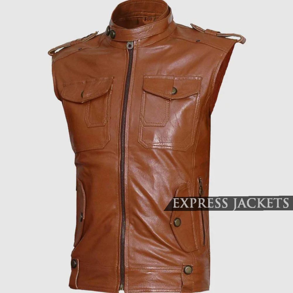 Tan Brown Leather Biker Vest with Epaulettes and Zip Closure for Men