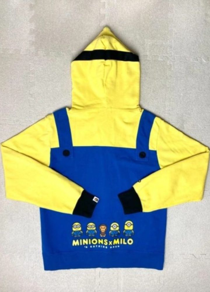 Minions Full Zip BAPE Hoodie. Made of high quality fleece fabric this hoodie is warm and super comfortable for daily casual wear. Its front zipper closure allows for easy on-and-off wearability, and an extra hooded collar keeps your neck warm type of style. Having full-length sleeves and snug rib-knitted cuffs, it provides a secure and comfortable fit. Two side waist pockets provide practicality letting you carry items or keep your hands warm. Made with a bright yellow and blue color palette, the hoodie channels the essence of fun and mischief from the Minions, paired with BAPE’s iconic streetwear flair.