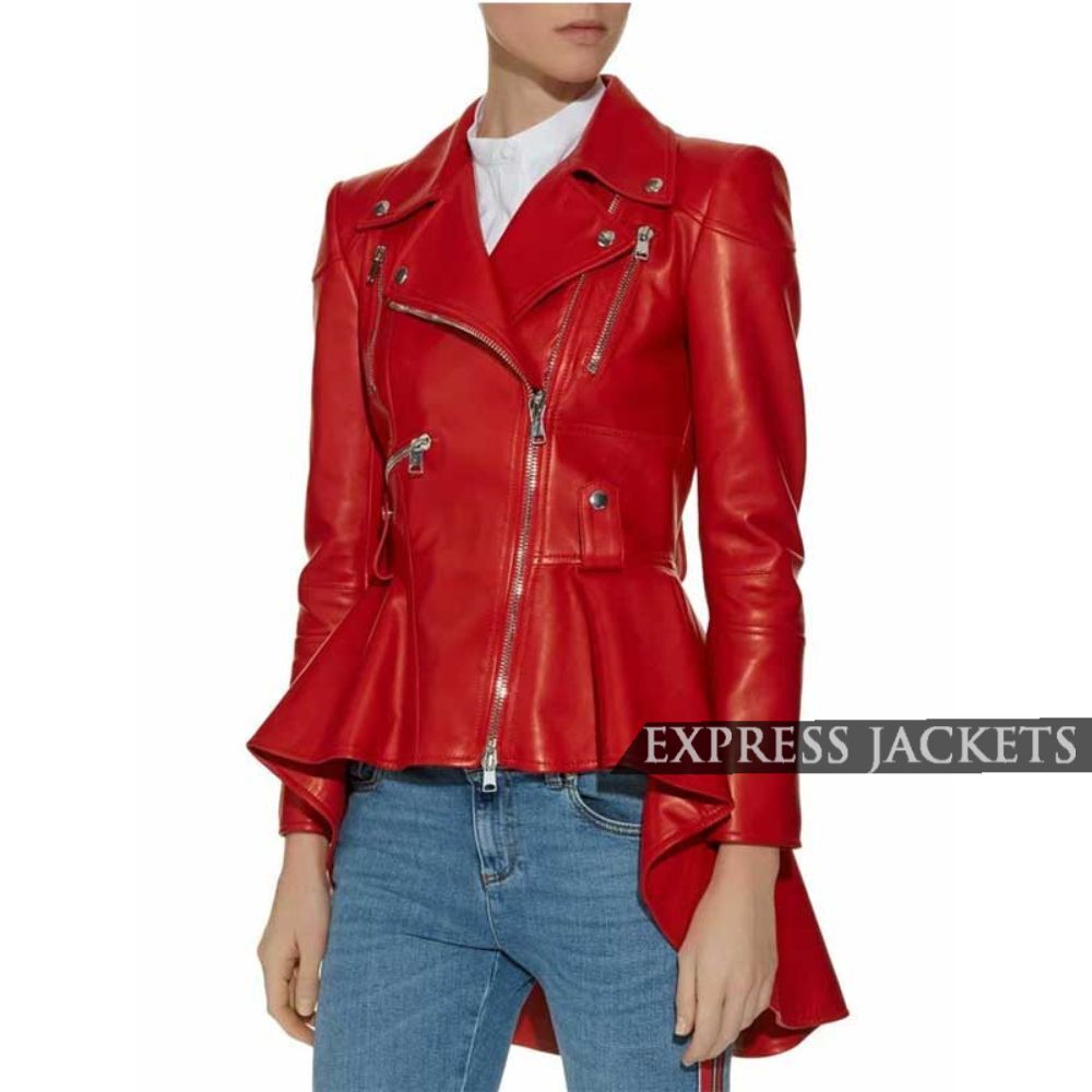 Women’s Red Leather Peplum Jacket — Motorcycle Style with a Chic Twist