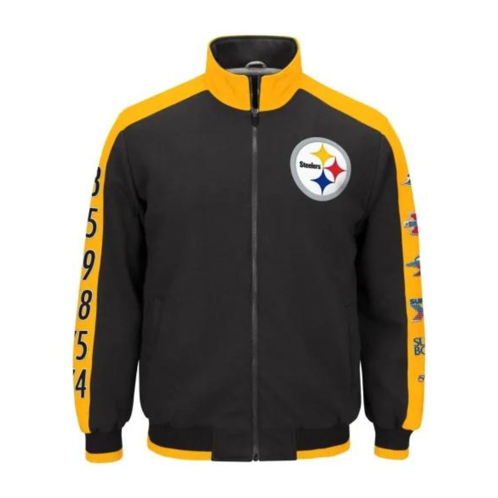 Ease meets style with the front zipper closure, allowing you to effortlessly showcase your team allegiance. The convenience of a zipper adds a modern touch to this classic jacket, making it a standout choice for any Steelers enthusiast.