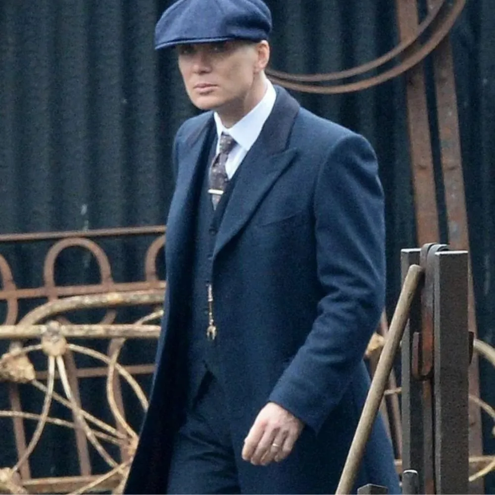 Be the distinctive Birmingham crime boss with the Peaky Blinders S05 Blue Wool Thomas Shelby Costume as seen on Cillian Murphy. The trench coat is made from high-quality blended wool fabric with classic styling, with a button closure, large notch collar and silhouette that you would recognize from a tailored British garment from the early 20th century. The ocean blue color is a fresh and more modern perspective from Thomas Shelby’s traditional color worn throughout the series while providing a soft viscose lining for added comfort and warmth. The structured design has full-length sleeves, front pocket and fitted overall design, so the trench coat can be a sophisticated statement piece in part to the nature and utility of the garment and has benefits for Peaky Blinders fans wanting to correlate the strong attribute of leadership throughout the series.