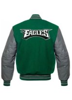 For dedicated fans, here is a green and white Philadelphia Eagles jacket . A jacket inspired by the Renegade Philadelphia Eagles, with a premium wool body and leather sleeves keeping you warm and cozy. Its rib-knitted stand-up collar, snap-tab button closure, and soft quilted viscose lining also aid in comfort and a proper fit. With a classic sporty flair, this varsity vibe jacket features long tailored sleeves with rib-knitted cuffs. Designed in the Eagles’ signature white and deep green, it features two side waist pockets, making it fashionable as well as practical.