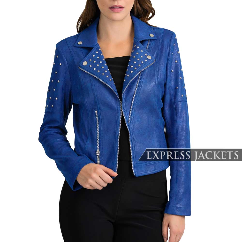 Careful about your jackets, which look great and provide you the chance of glance and attraction. As they come with some uniqueness, with casual dressing, pair it with a white button-down shirt, jeans, and some heels for a refined look. What is this? And why is it important to be a part of your wardrobe? It is a royal blue jacket that is made with real leather and an inner viscose lining. The design has a complete feminine look, which offers studs on the collar and upper portion of the sleeves. Other supporting highlights are lapel collar, front zip fastening, full sleeves, and multiple pockets. It is an ideal approach for a daily routine that ensures a soft but updated look in your personality.