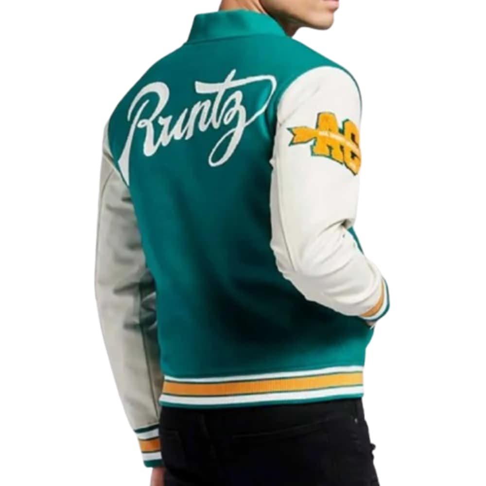 The Runtz All County jacket features a classic letterman cut and is made out of high-quality fabrics, which makes it easy to wear and stylish at the same time. The body of the jacket is made of warm wool material, and its arms are made of leather, which makes this piece of clothing very fashionable and durable as well. The rib knit collar and cuffs give it a traditional feel, while the snap tab closure gives a refreshing perspective to the style. This jacket comes in different color combinations, such as black, navy blue, green, and yellow navy blue, which helps in meeting different personalities. The viscose lining inside the jacket gives comfort to the wearer, making it suitable for all seasons. Perfectly designed for all men and women, this jacket is unisex and commands confidence and style. This letterman bomber jacket is available at Express Jackets with amazing free express shipping anywhere across the globe. Therefore, this jacket is perfect for people who do not wish to compromise on comfort while making a bold fashion statement.