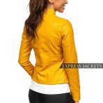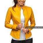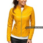 The ideal combination of front line and class, this delightfully created leather jacket is the latest design that should be the part of every lady closet. It has been designed and made with high consideration regarding its subtleties. We give significant consideration to ensure every detail is lovely, from the color to the stitching; top-notch stuff has a soft viscose lining, making it a comfortable choice for regular days. This Slim-Fit Yellow Ladies jacket has a standup collar with front zip support for closing, full sleeves have an open hem cuff, and multiple outside and inside pockets give enough space to carry your belongings. It is ideal for wearing this beautiful top layer with a black top and black leather pants. Available in all sizes, do check our size chart before ordering.