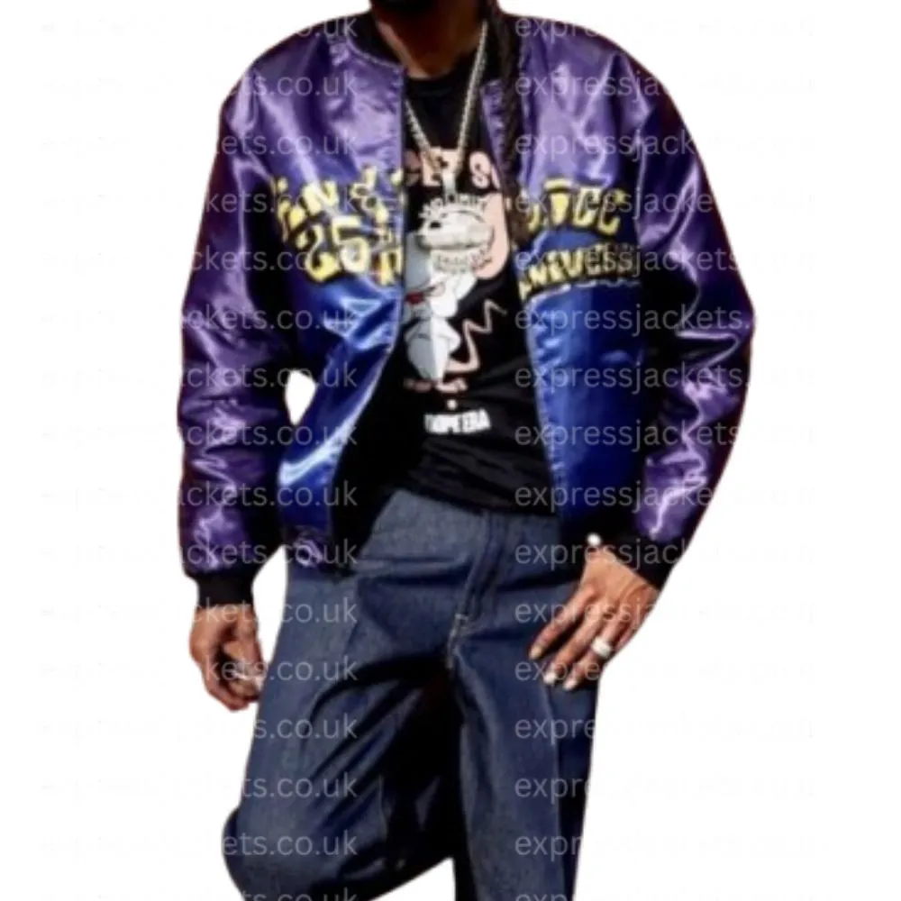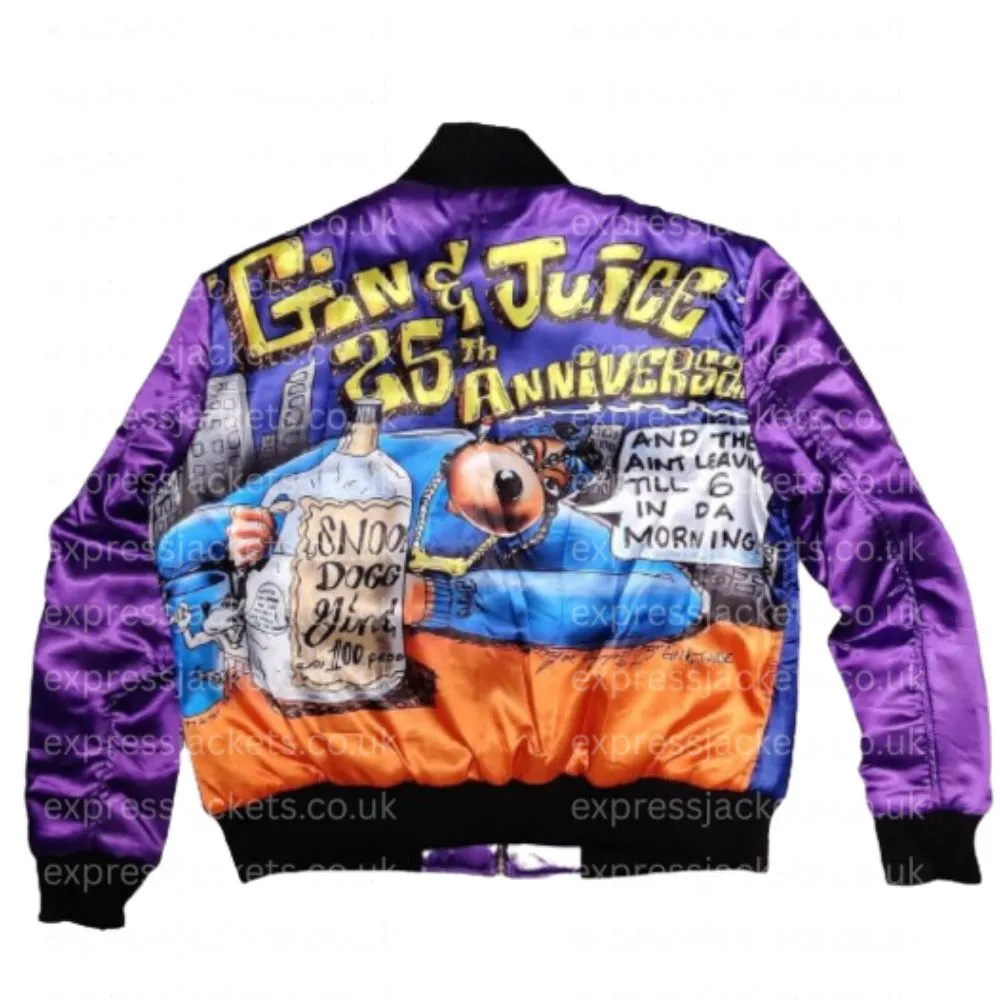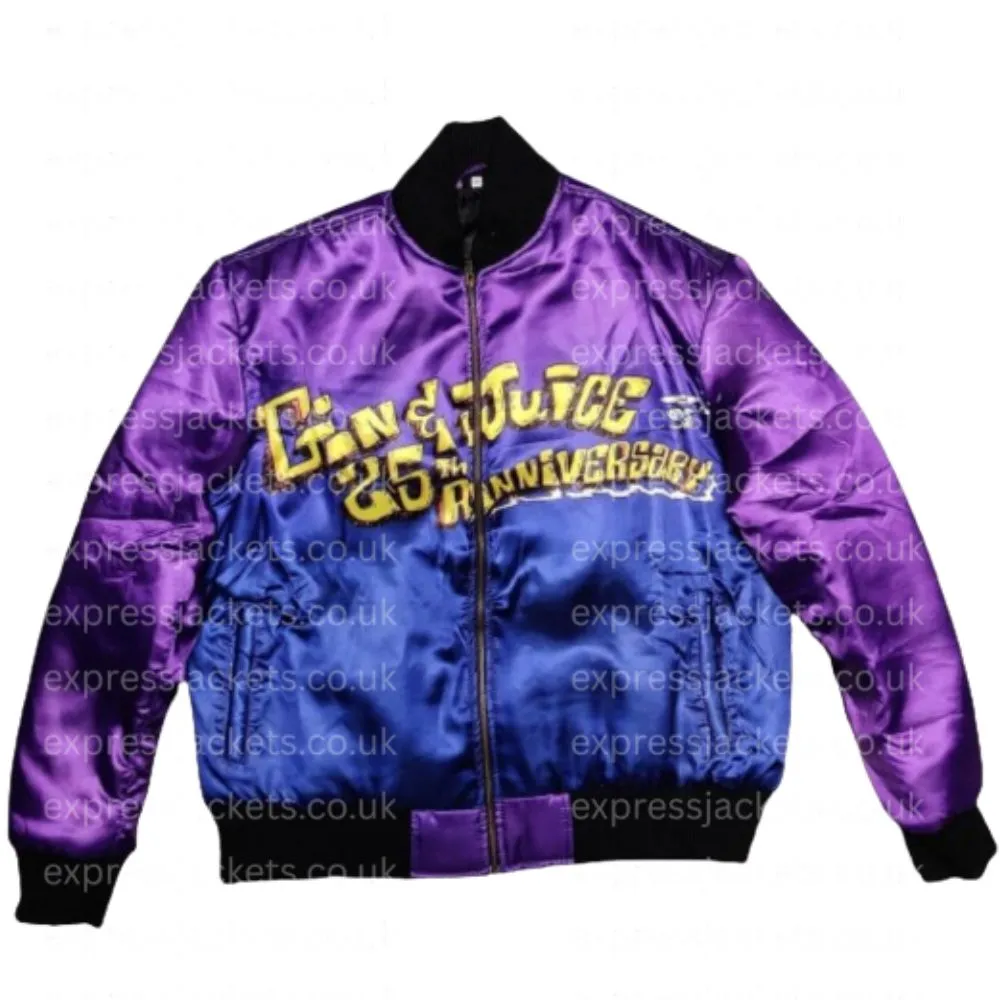 Elevate your streetwear game with the Snoop Dog 25th Anniversary Gin and Juice Bomber Satin Jacket which we present in a smooth satiny finish and classic bomber design. This piece brings in a touch of the past with its bright blue color and present day edge.