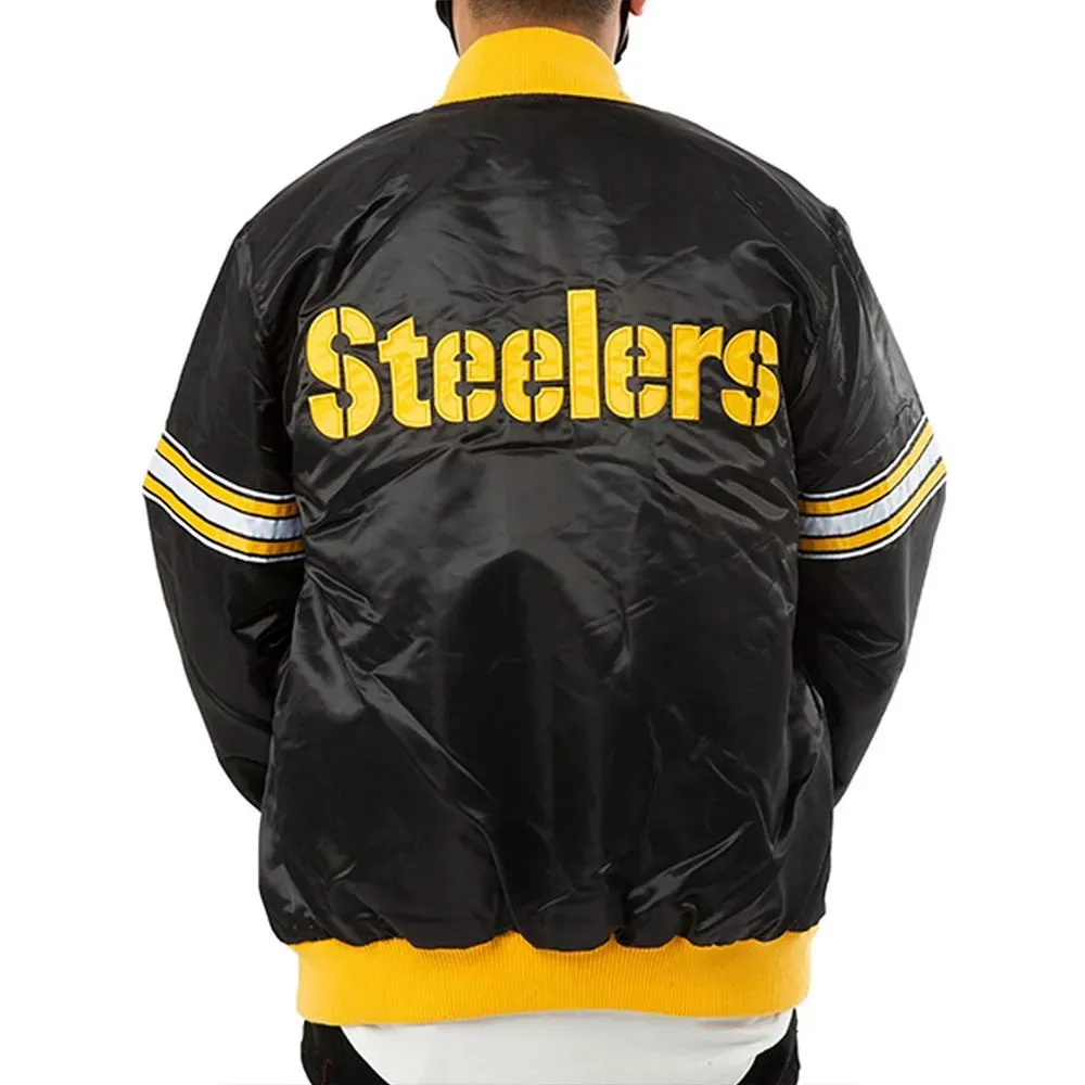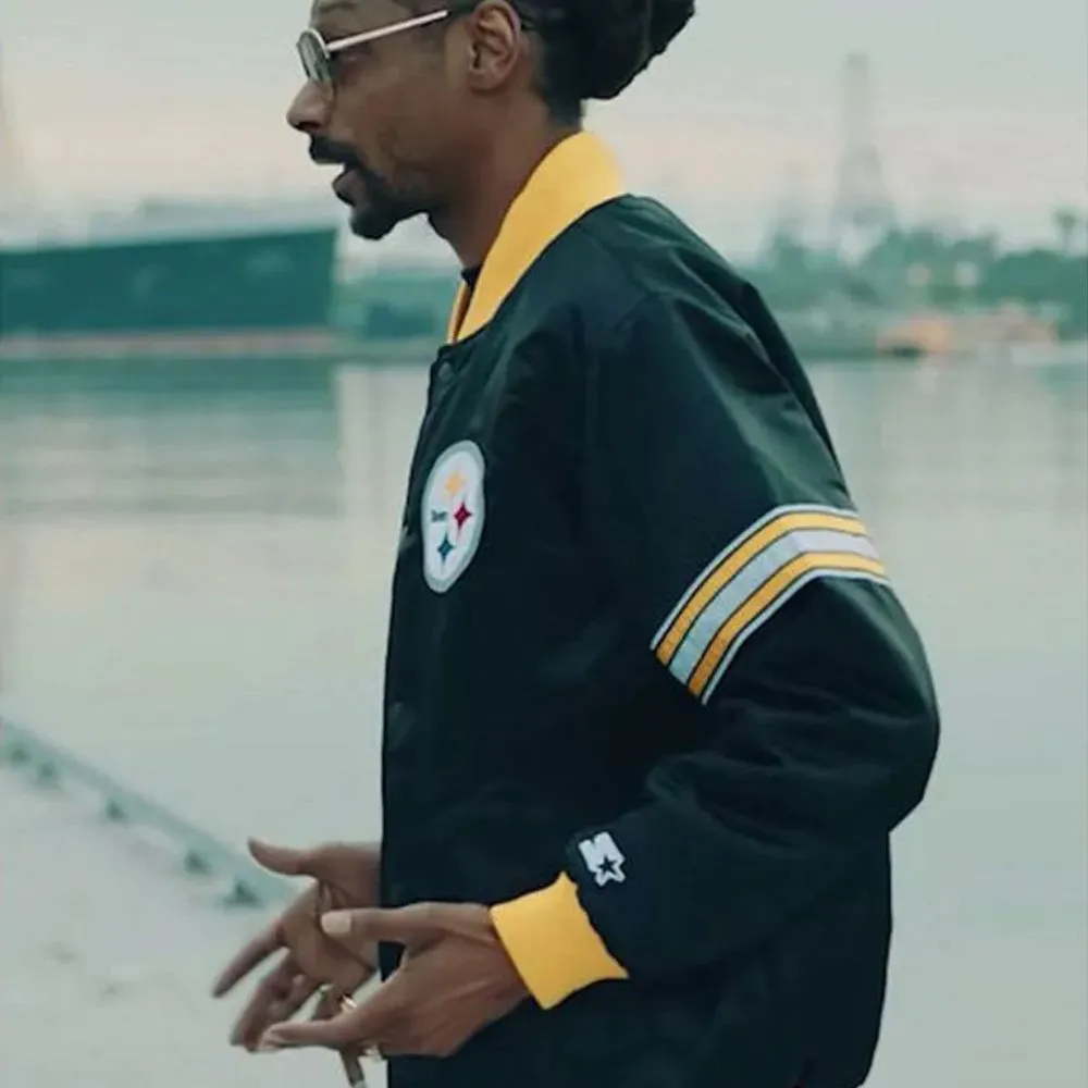 Show off your support for the Pittsburgh Steelers with our Snoop Dogg Jacket which we designed in collaboration with Snoop Dogg. This piece is inspired by the great history of the American football team and Snoop’s unique fashion sense. We made this jacket out of high quality satin and added a smooth viscose lining for that extra touch of luxury. It is very light in weight yet has a very modern look which is almost glossy. We included ribbed knit at the collar, cuffs and hem for a durable and form fitting look which also pays homage to the classic varsity style. The front is button up which we left that way to keep that traditional look. Also it has two outside pockets and two inside pockets which is very functional. The black color is very bold which brings out the best in classic Steelers wear and goes great for game day, running errands, or a night out. Whether you are a fanatic of the Pittsburgh Steelers or a Snoop Dogg fan this jacket is a must have which is a mix of sports and street fashion culture.
