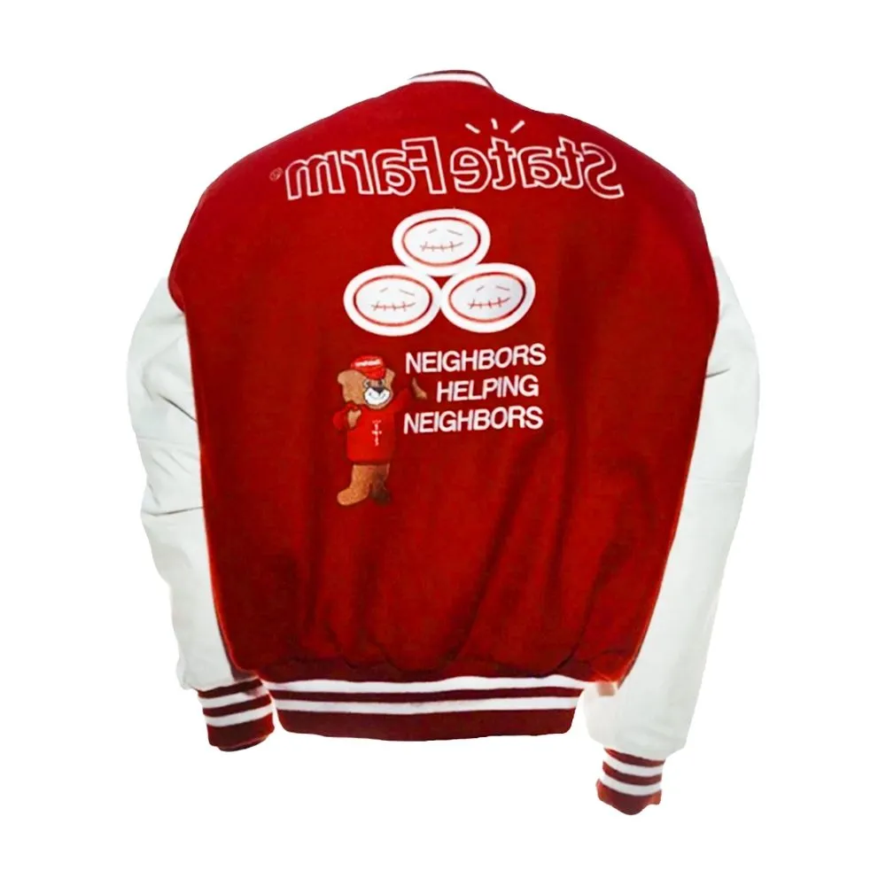 Make a statement in the Travis Scott x State Farm Varsity Jacket, a bold combination of streetwear and vintage varsity vibe. The body of the jacket features a wool look and the sleeves are a contrasting, white leather. The wool and leather materials are durable while the inner lining is incredibly soft for comfort, while offering a classic button closure and rib-knitted collar and cuffs for a classic athletic vibe. The striking red and white make it appealing to fans of Travis Scott or anyone looking to upgrade their outerwear collection.