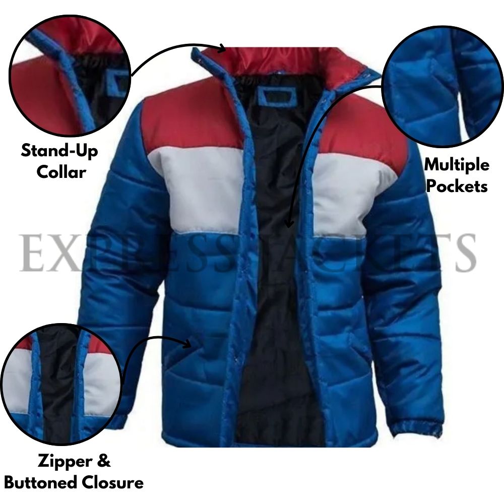 David Harbour Stranger Things Season 4 Jim Hopper Puffer Jacket It is the iconic Jim Hopper puffer jacket from Season 4 of Stranger Things. This is made of premium parachute stuff. Comes with soft viscose lining on the inside, zipper and buttoned front closure. This blue jacket has a stand-up collar, long sleeves with elastic cuffs and several pockets.