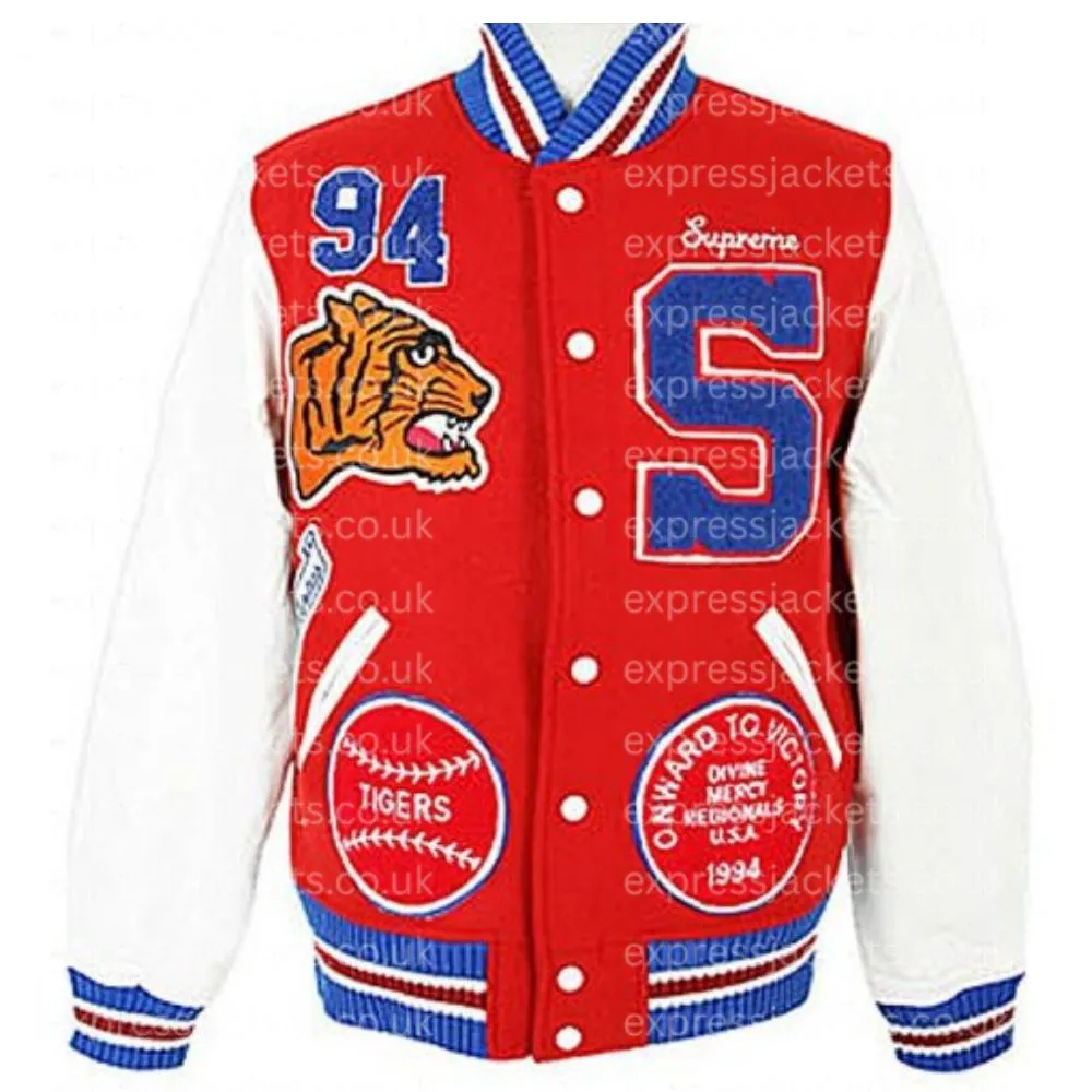 Wear the Supreme Tiger Logo Varsity Jacket to make a statement, it brings together great streetwear design with traditional varsity style. With its bold red and white color scheme and embroidered tiger logo it stands out which is great for your casual and urban wear.