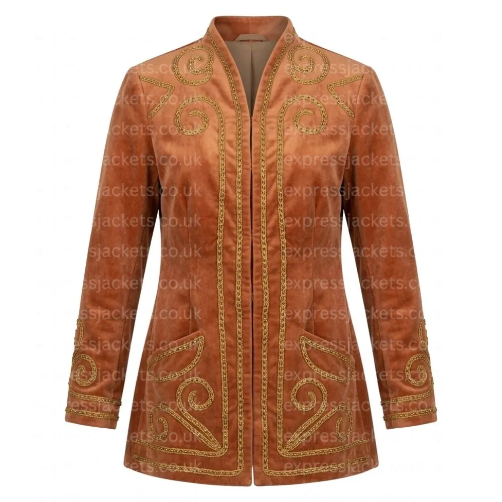 This jacket is made of high quality suede which also gives it a very soft hand feel and great durability. Also we have a soft viscose inner which gives all day comfort. It has an open front design for a very relaxed look which we pair with a round neck collar that brings in a very clean and modern feel. The jacket features full length sleeves which we’ve decorated with embroidery at the cuffs, that is what we’ve done to give it a very unique and stylish touch. In terms of function we included two side pockets which is great for keeping your must haves close at hand. Also in brown which we think adds to its classic and very versatile look.