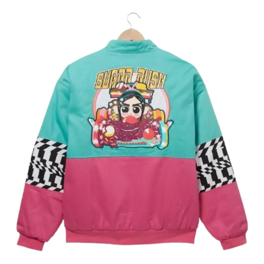 Show off the fun and playful style inspired by Wreck-It Ralph with the Vanellope Von Schweetz Racing Jacket. Made from lightweight polyester fabric with a soft viscose lining, you find comfort in an animated style in every detail. The pink and blue color way is quintessential Vanellope, while the erect collar, front zipper closure, ribbed cuffs and full length sleeves add a sporty detail. The jacket features two waist and two inner pockets to give you functionality and fun for everyday or cosplay.