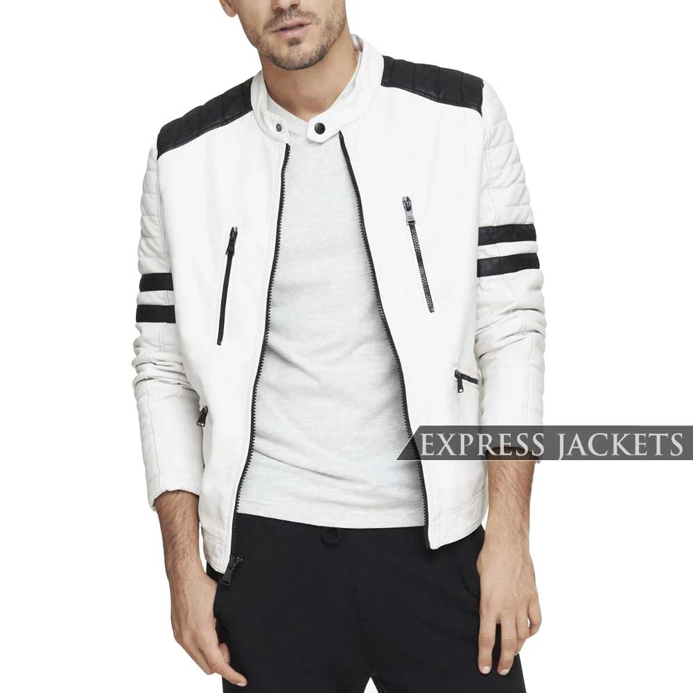 MEN WHITE LEATHER JACKET WITH BLACK STRIPES