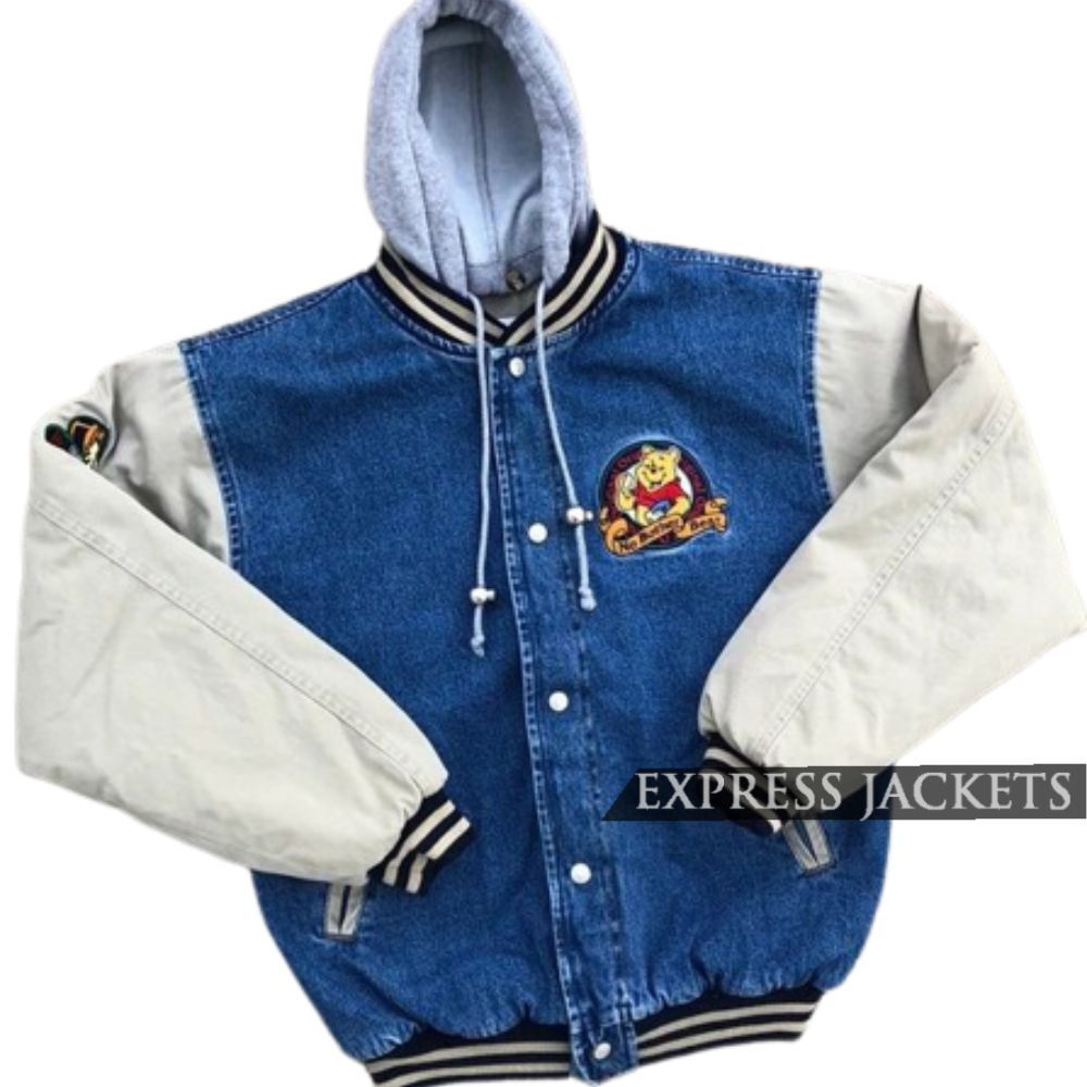 Infused with elements from the beloved animated character Winnie the Pooh, this denim varsity jacket is whimsical yet classic and comes at an affordable price for those who desire to mix childhood memories with contemporary style. It features a wedge of denim and a generous contrast of off-white and creates a classic look of a varsity jacket but with whimsical elements.