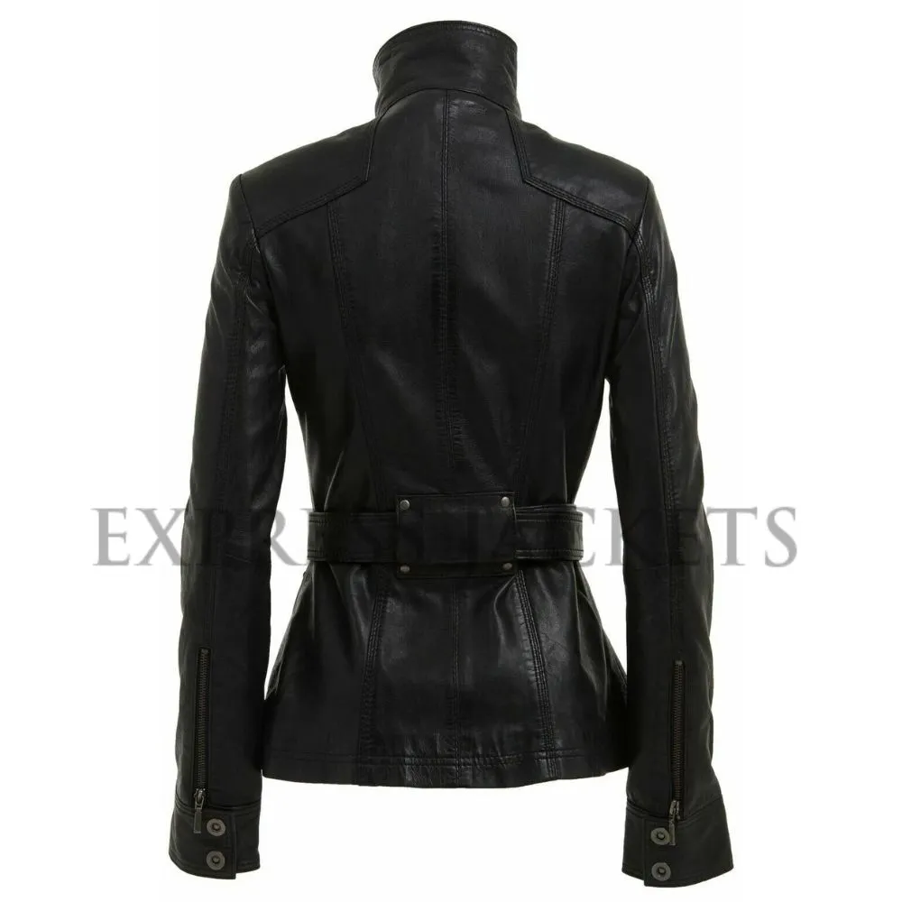 Make a statement with the Women’s Black Button-up Leather Jacket, the perfect balance of structure and sophistication. Made with real leather, this jacket has both typical form and flattering fit that come with a stand-up collar, full sleeves with zipper cuffs, and a waist belt that cinches just right. This jacket has a flap pocket to give this jacket style with utility, and a clean button closure with a confident finish. Also sold in faux leather for environmentally friendly eye-catching outerwear.