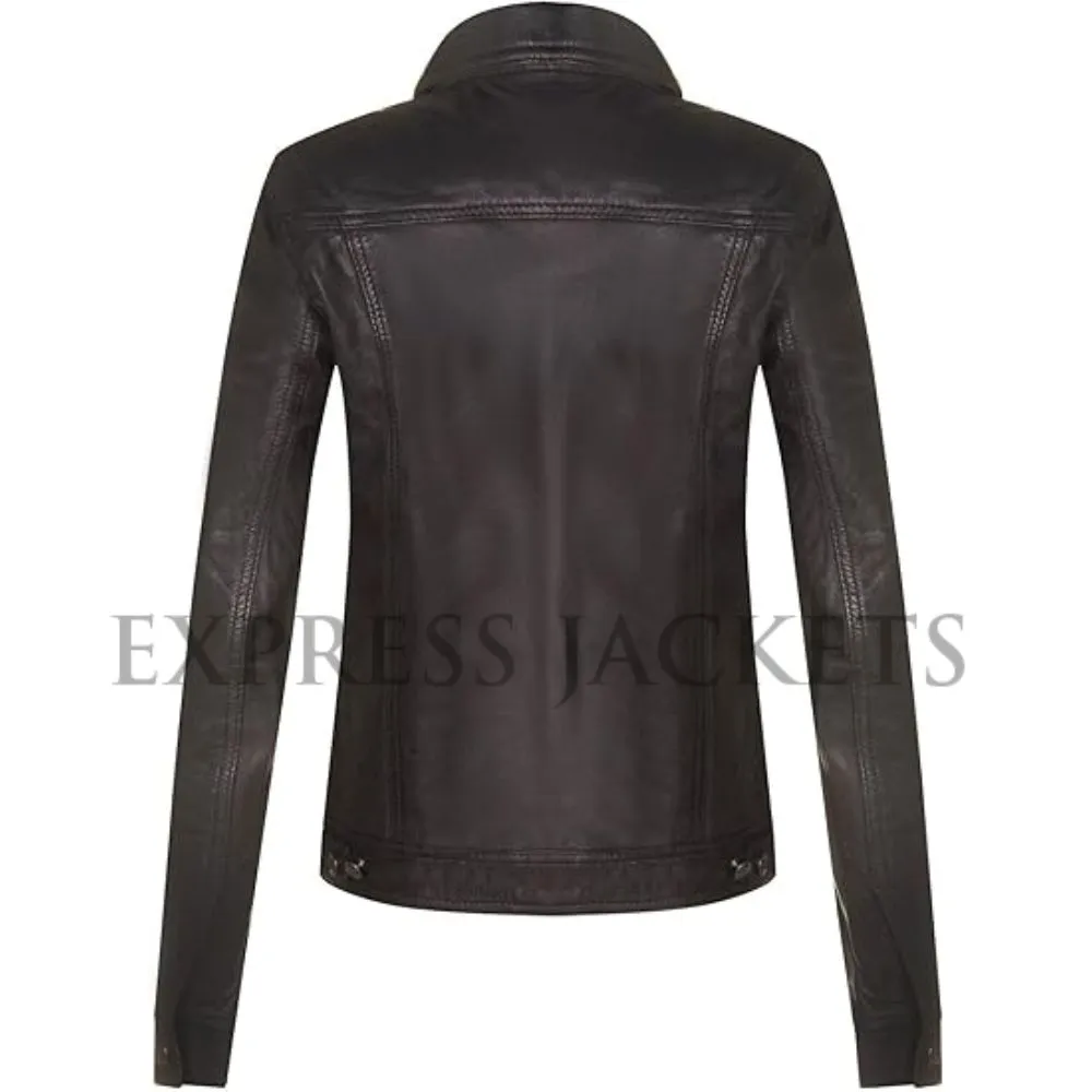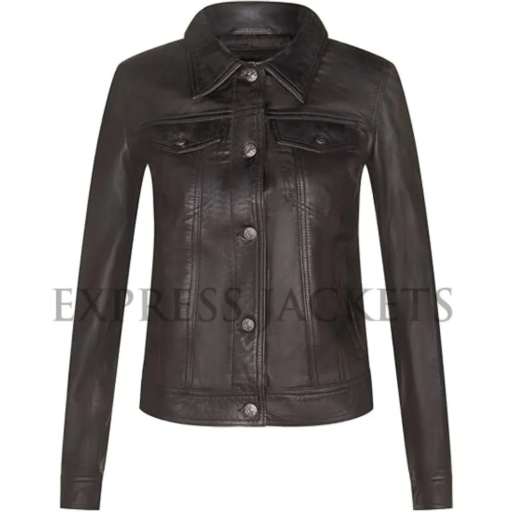 The trucker jacket is made with denim material, but as we know, the altering of fashion is so speedy we present this Women’s Black Leather Trucker Jacket. It is made with supple and top-notch leather material. The features are identical and look amazing with the attire. You can bring creativity to your style if you replace this leather trucker jacket with denim fabric. Its black color is lovely, and it feels easy to indulge in casual styling. The upper has an internal lining of viscose, which is suitable for warmth and comfort. The design of this top layer contains the features of a shirt-style collar, front button closure, full sleeves with buttoned cuffs, and pockets. The top wear is good to go perfectly for hangouts and weekend plans. This fashion piece is available for everyone’s budget, we take care of your fashion needs, and this incredibly stitched outerwear is reasonably practical in many ways.