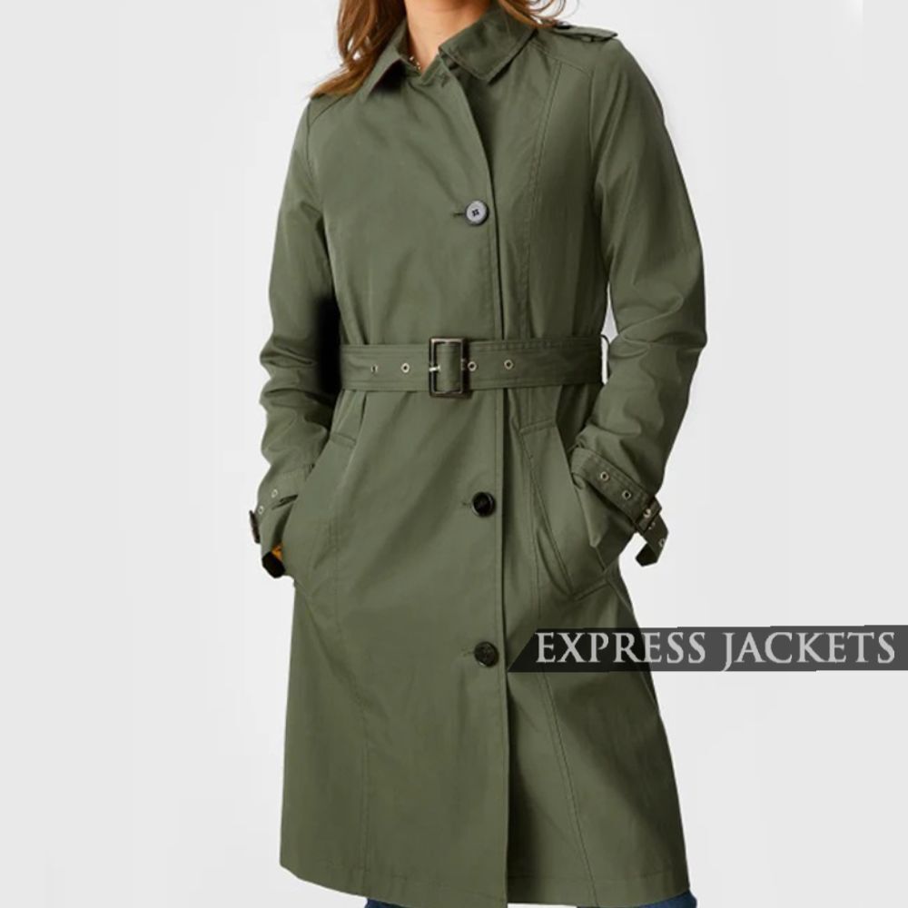 Women’s Green Cotton Double-Breasted Coat – Quilted Moto Style with Belt
