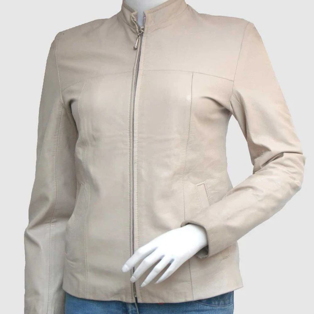 Cream Women’s Slim Fit Cowhide Leather Jacket – Minimalist Chic Style