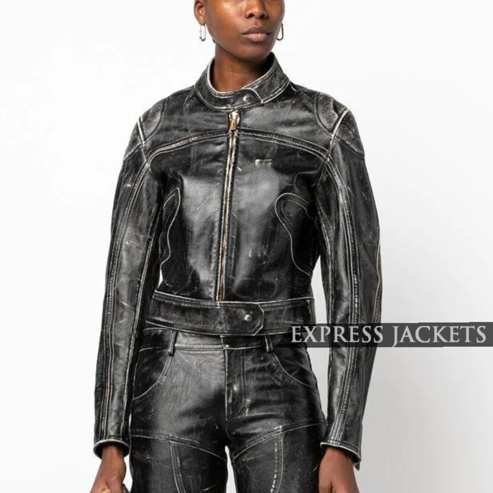 Fitted Women’s Distressed Leather Jacket in Black with Adjustable Belt