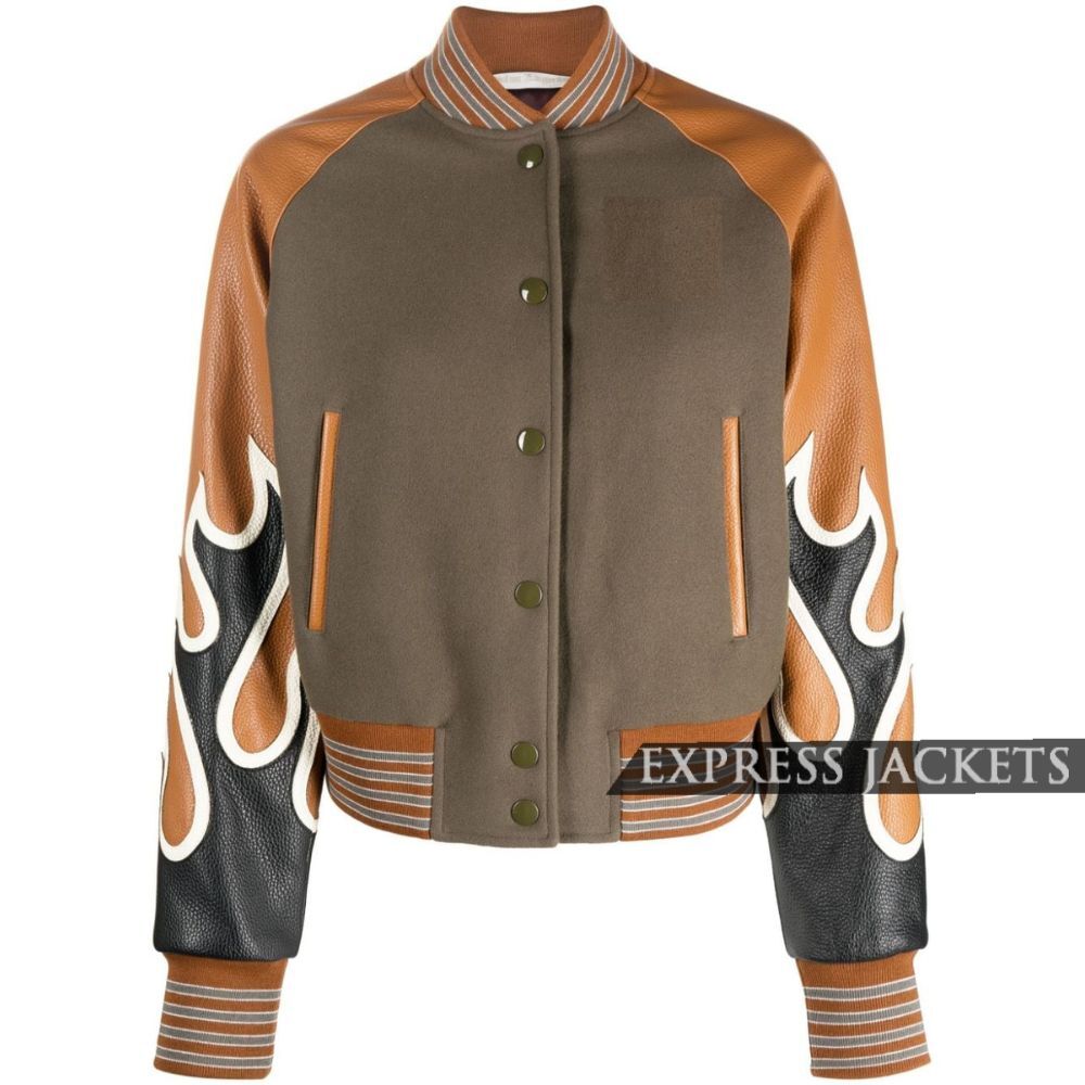 Turn up the heat on your street style with the Women’s Flame Print Leather Bomber Jacket. Made from genuine or faux leather, this women’s bomber jacket in black is embellished with bold red and orange flames, and is fashioned to create a classic bomber fit with rib knitted collar, cuffs, and waistband. This is a very cool casual jacket that’s made to wear loose fitting around the body. The zippered front offers a secure wear and comfort while wearing, with two side waist pockets, and one or two inside pockets. The jacket is fully lined with soft viscose to ensure coziness, and comfort that will allow you to wear the jacket all day. This is a great jacket to wear out to a concert, as part of a street-style look, or a casual outfit for the weekend. Whatever you decide, this flame bomber jacket is sure to boil over some heat.