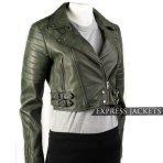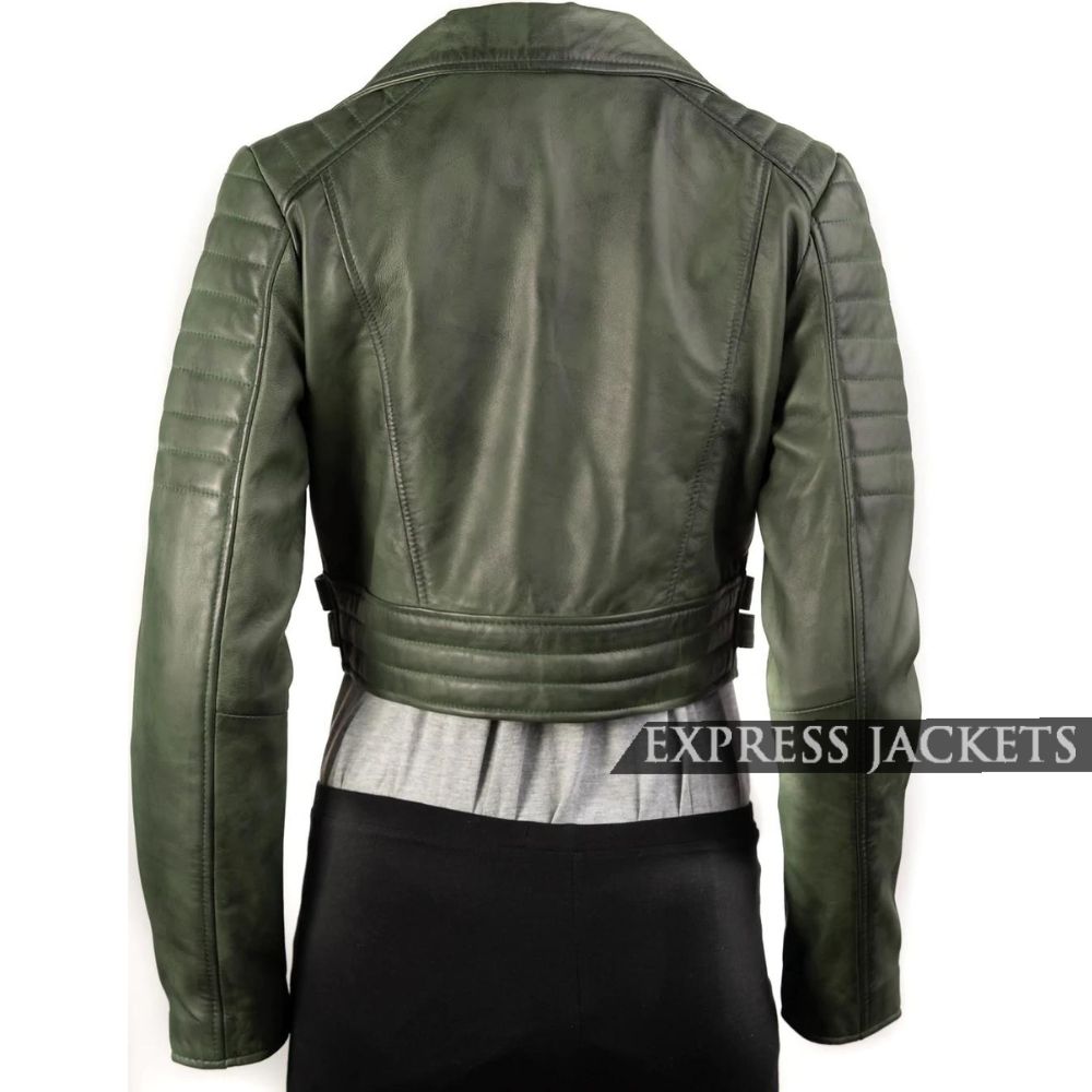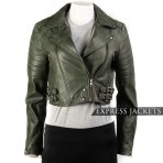 Adding to its artistic appeal is this adventurously designed Women’s Cropped Green Leather Jacket that is obtainable at Express Jackets, a fusion of the traditional and the modern in equal proportions. With its high-quality leather, this jacket comes in an invigorating deep green that breaks the monotony of the expected leather jacket colors. Dressed in a classic motorcycle jacket design, it has an asymmetrical front zipper with wide lapels, giving it a fierce appeal. Decorative straps on the sides add an interesting detail, making its amazing stylishness even more impressively distinctive. The jacket comes with moderately quilted sleeve detailing, which enhances the richness of the jacket’s overall design. The cropped character of the jacket, due to its construction, gives the modern wearer a suitable shape that can be worn on top of pencil high-waisted jeans, skirts, or trousers. To complete this look, simple black bottoms are incorporated into the look, bringing out the stylish appearance of the outfit. This twisted green leather crop jacket is suitable for changeable use for the reason that the styling is very playful and simple or edgy and elegant when required.