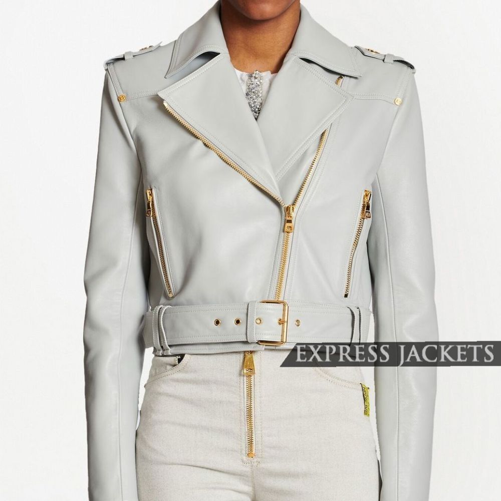 Be the first to review “Women’s Grey Leather Golden Zip-Up Biker Jacket” Cancel reply
