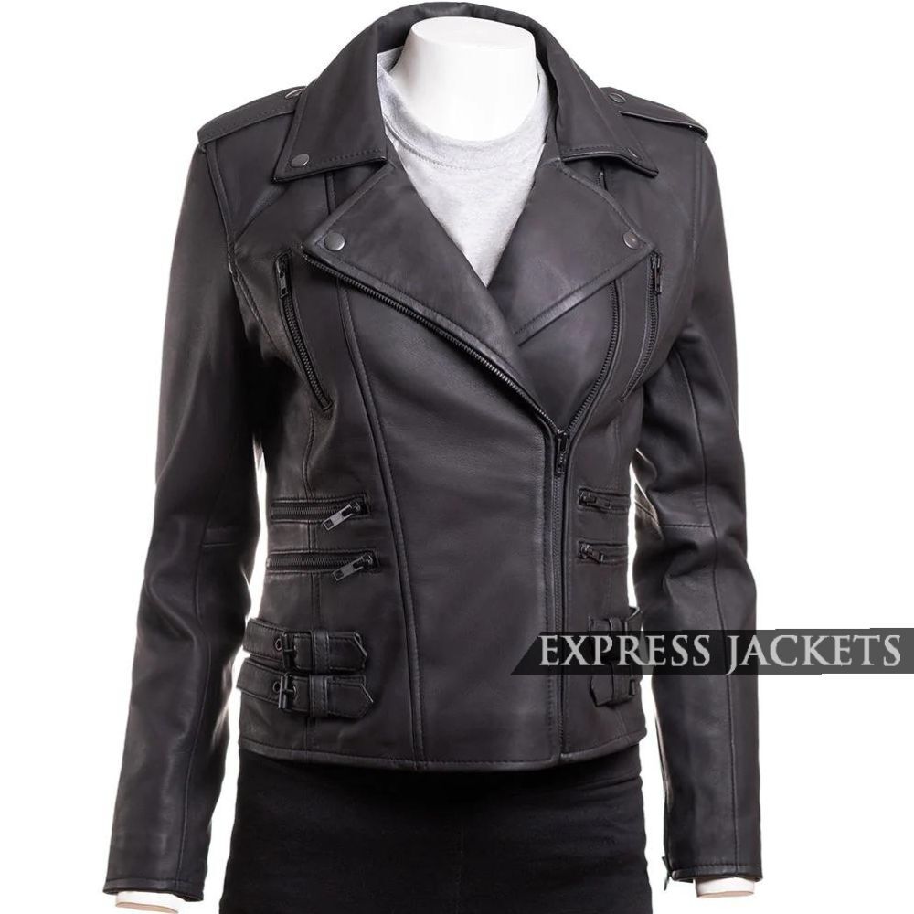 Women’s Matte Black Asymmetric Biker Leather Jacket with Buckle Belt