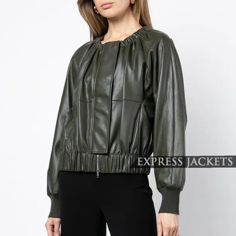 The shape of this trendy green leather jacket is designed in an advanced manner. Constructed from the finest leather, the jacket is almost too difficult to wear, as the depth of the color is both impressive and intimidating to any collection of fashions. Shaped in an oversized manner Cut, this jacket can be worn in any style with ease, elevating it from easy level to smart casual. Among several of the pronounced attributes of this jacket, most should be the gathered collar, which is an added feature that is stylish yet graceful to the eyes. The back of the jacket has two vertical seams that are both functional and add finishing to the clean appearance of the jacket. The sleeves are puffed at the shoulders, which adds a cheeky contrast to the otherwise harsh structure of the body. An elasticized hem and cuffs are provided. Provides closure, keeping the cold from creeping in. This alternative enhances not only comfort but the appeal of the overall look as well. The simplicity of the cut of the jacket makes it easy to match with other clothes. Attire can range from casual jeans and sneakers to fitted pants and boots for smart occasions. All in all, this detailed green leather jacket is for those who like to be practical yet have a keen sense of style.