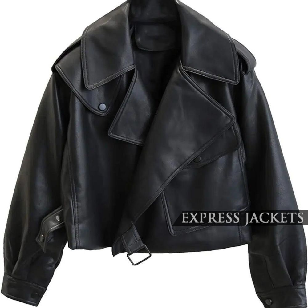 Women’s Oversized Black Cropped Leather Jacket – Wide Collar Belted Street Style
