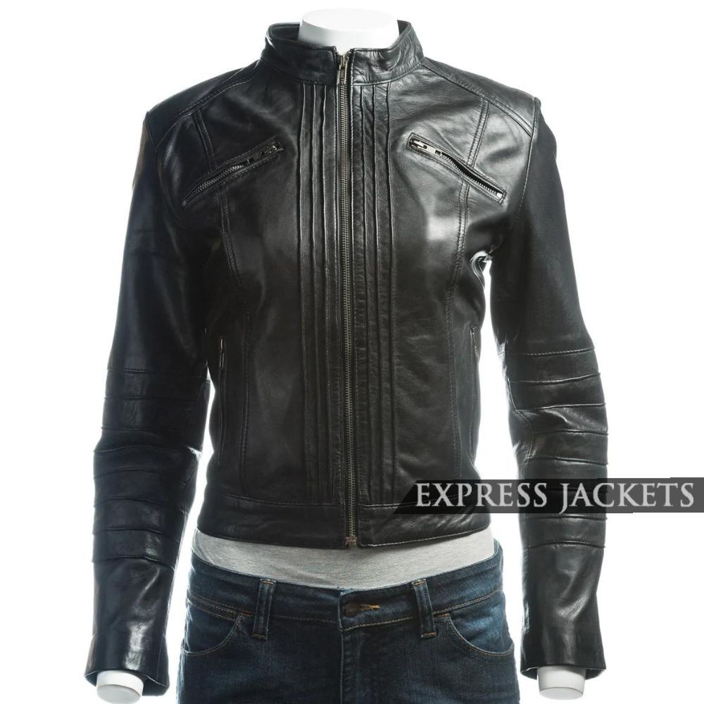 Black Pleated Front Biker Leather Jacket for Women