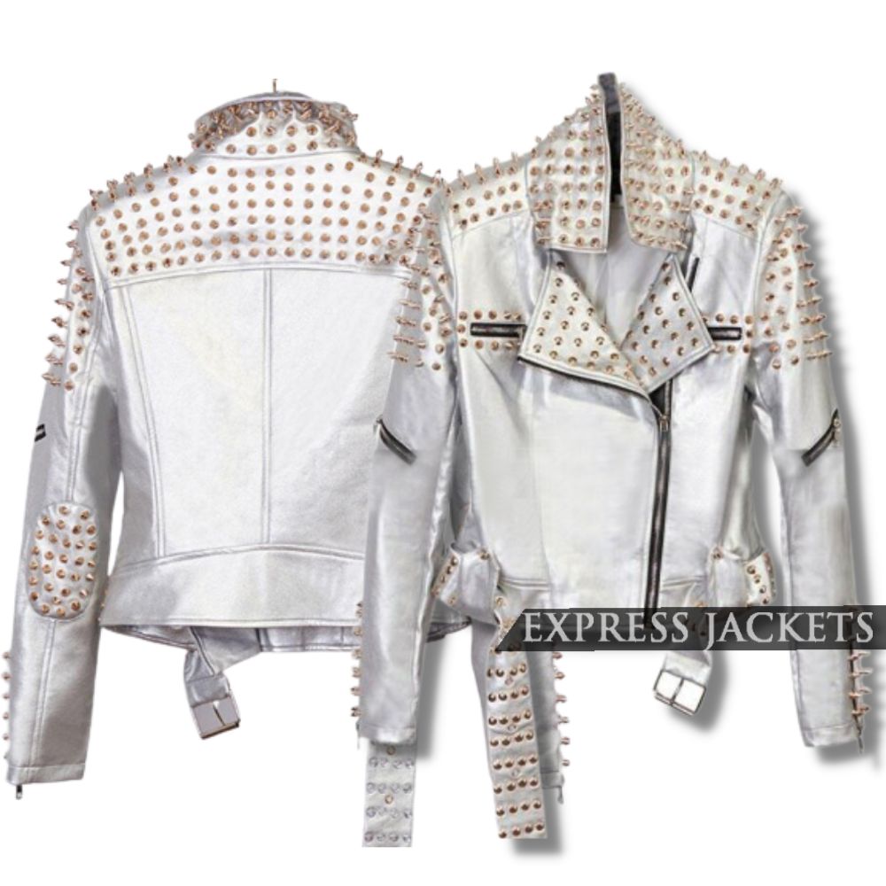 Nowadays, everyone has different fashion tastes and tries to impress others with creative ideas for clothing, and only a good-looking jacket can complete it. The material matters, but leather can beat any other fabric easily. There are always grace and fashionable vibes attached to this wardrobe staple, creating powerful personality effects. Detailing in these fashion pieces is different, sometimes they contain studs, spikes, and stitching patterns. Still, the strongest impact of a personality completes with a beautifully stitched faux outfit in high-quality leather. For weekly and everyday use, this Studs and Spikes Jacket in the women’s category beats the violent ways of presentable personalities, and its top-notch and supple external and internal kinds of stuff enhance one’s feminine appearance. Its white color with metallic prongs feels like a small element but an impacting factor for a fashionista. The pointed objects have been designed on the lapel collar, waist belt, sleeves, and an upper body portion. Its creativity speaks about functionality from zippered cuffs to front closures and pockets.