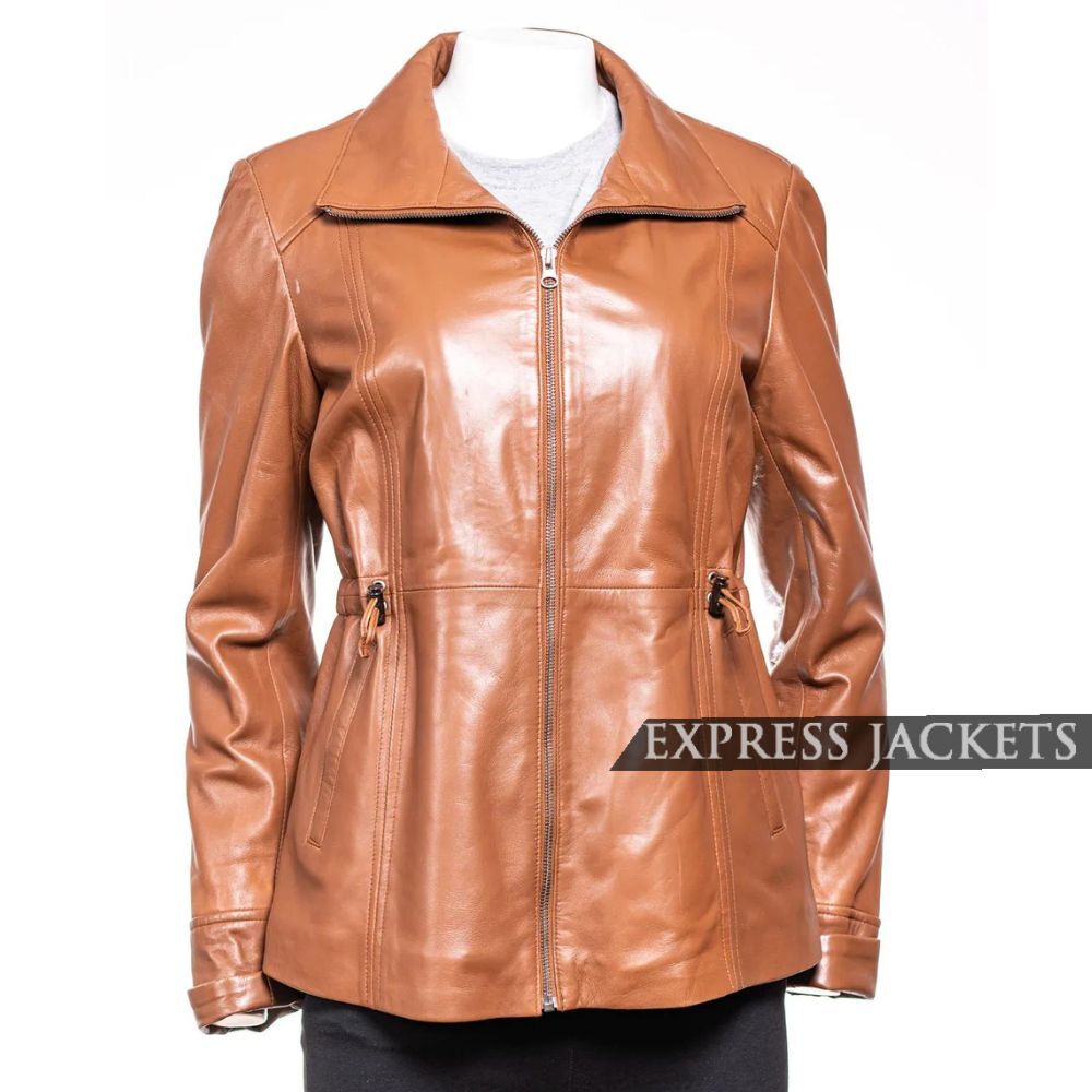 Women’s Tan Hip-length Toggle Waist Leather Jacket